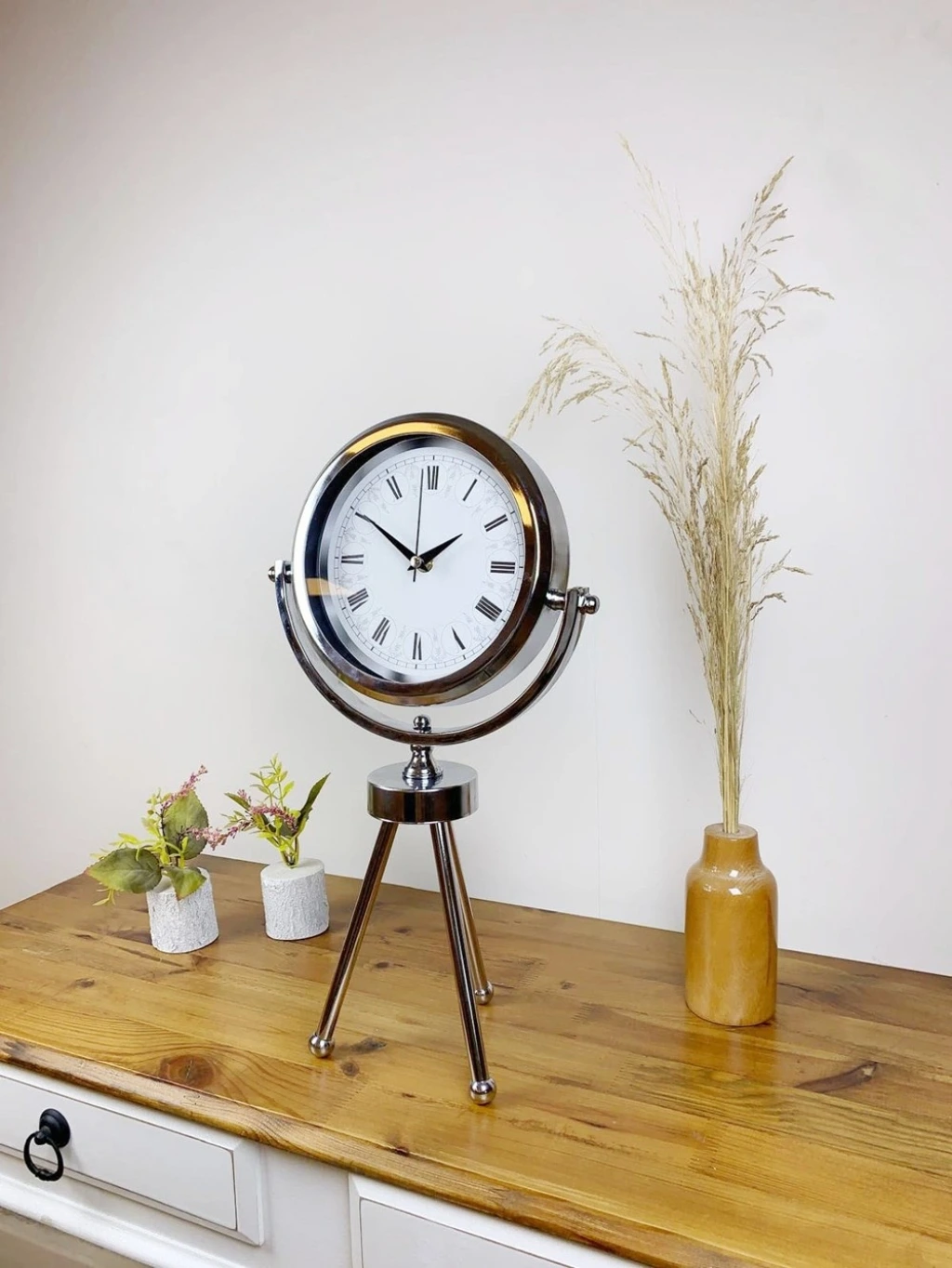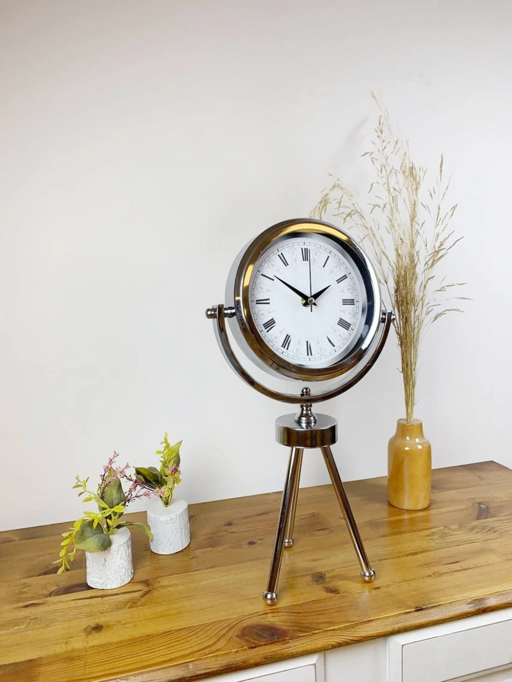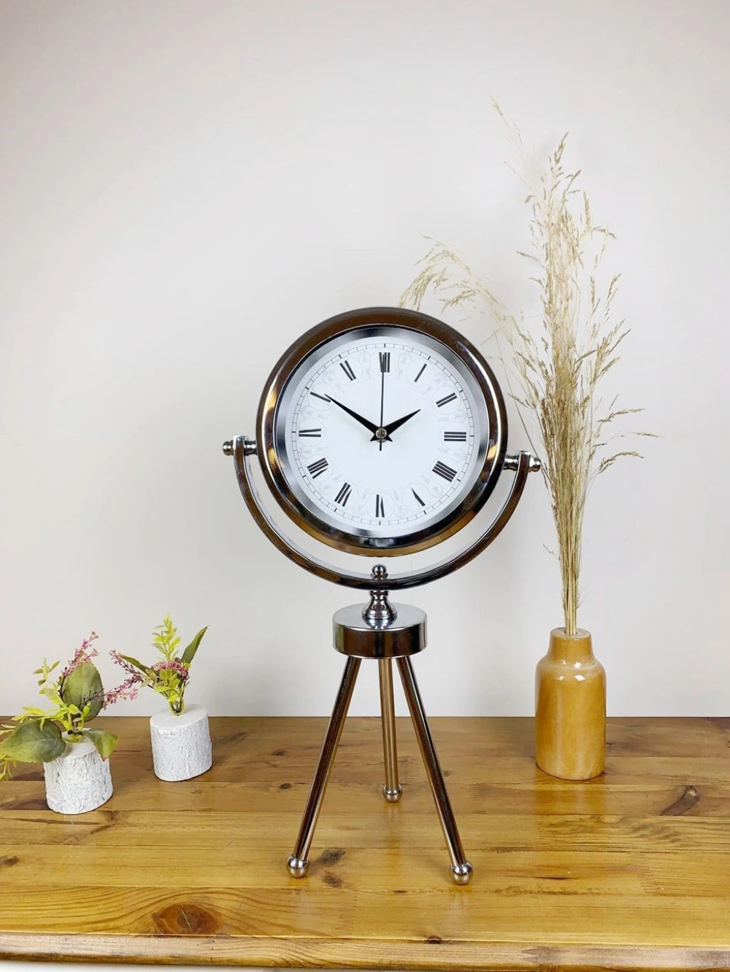 Şık ve modern tasarımıyla dikkat çeken  krom kaplama mini tripod masa saatimiz, sessiz akar saniye mekanizmasıyla konforlu bir kullanım sunar. Gerçek cam koruma paneli sayesinde uzun ömürlü ve dayanıklıdır. Estetik görünümüyle hem ev hem de iş yerleri için ideal bir dekoratif üründür.