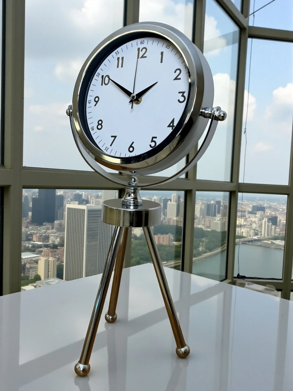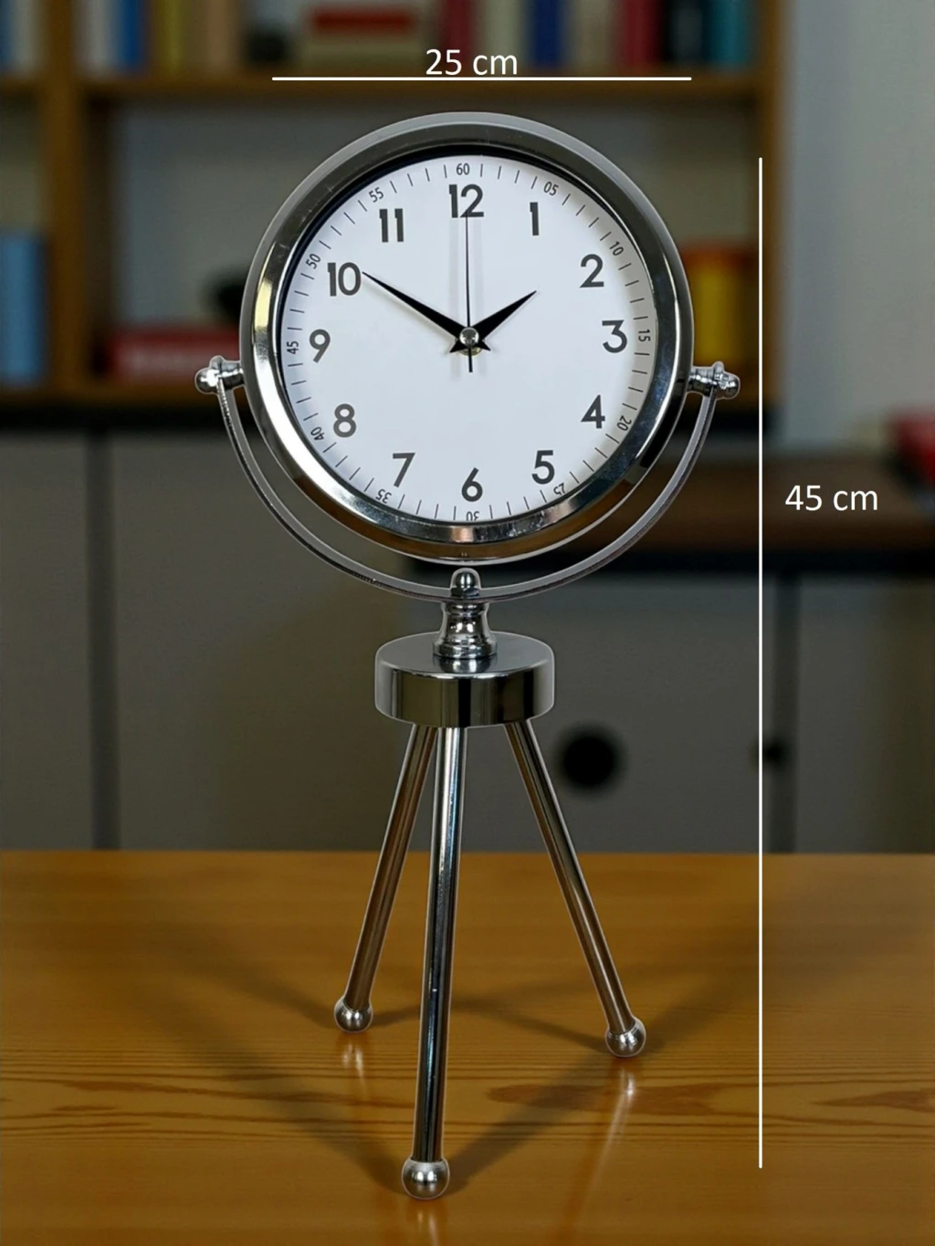 45 x 25 cm ölçülerindeki bu şık krom üç ayaklı masa saati, modern tasarımı ve parlak metal gövdesiyle her ortamda dikkat çeken zarif bir dekorasyon ürünüdür. Gerçek cam korumalı kadranı sayesinde uzun ömürlü ve net bir görüntü sunar. Sessiz çalışan mekanizması ile ev, ofis ve çalışma alanlarında konforlu bir kullanım sağlar. Dayanıklı metal tripod ayak yapısı, saati sadece bir zaman göstergesi değil aynı zamanda estetik bir obje haline getirir.