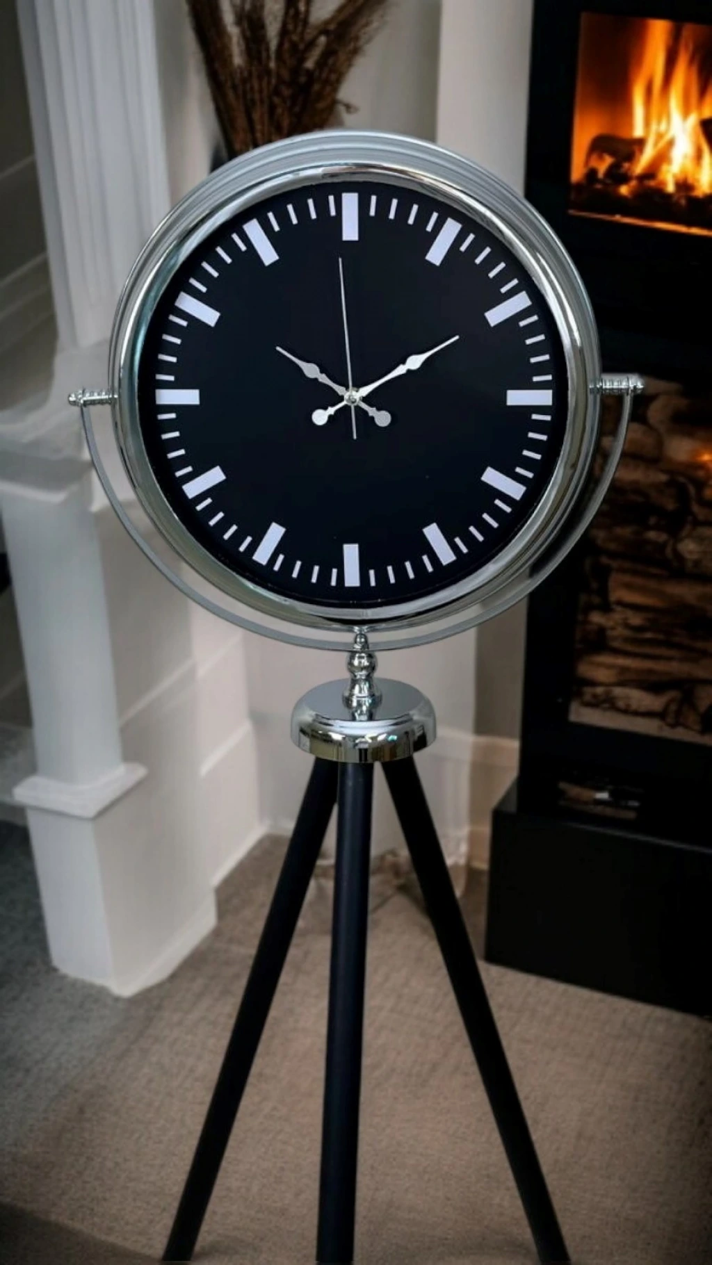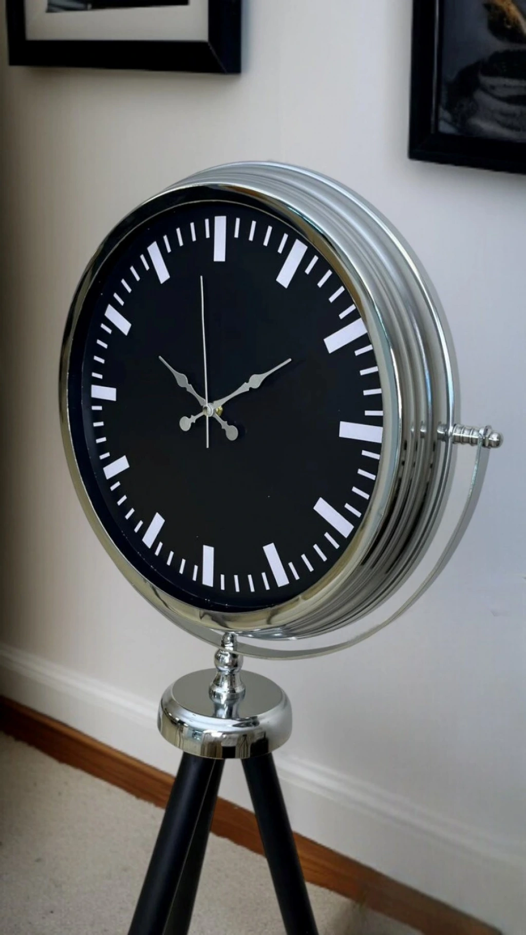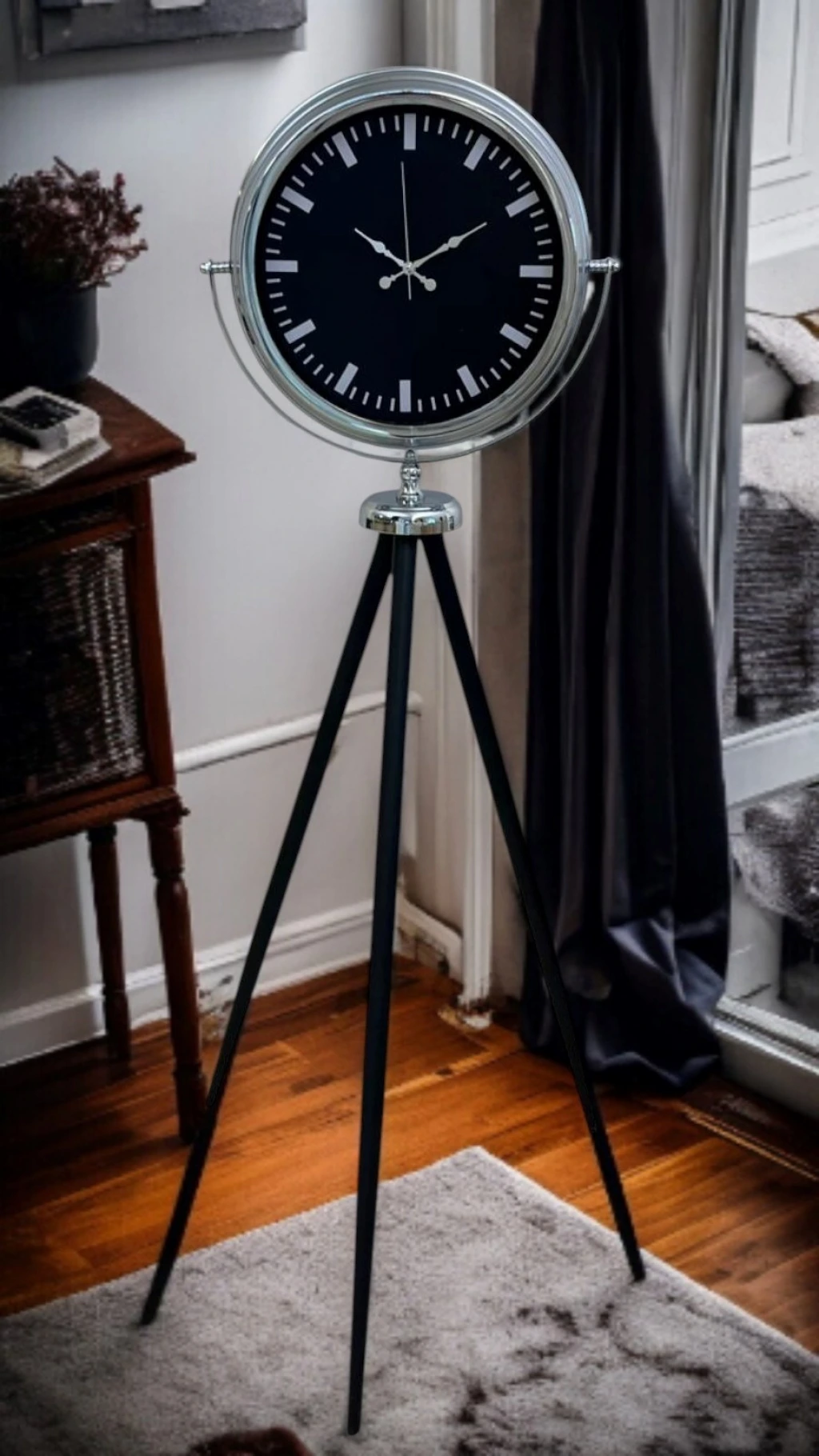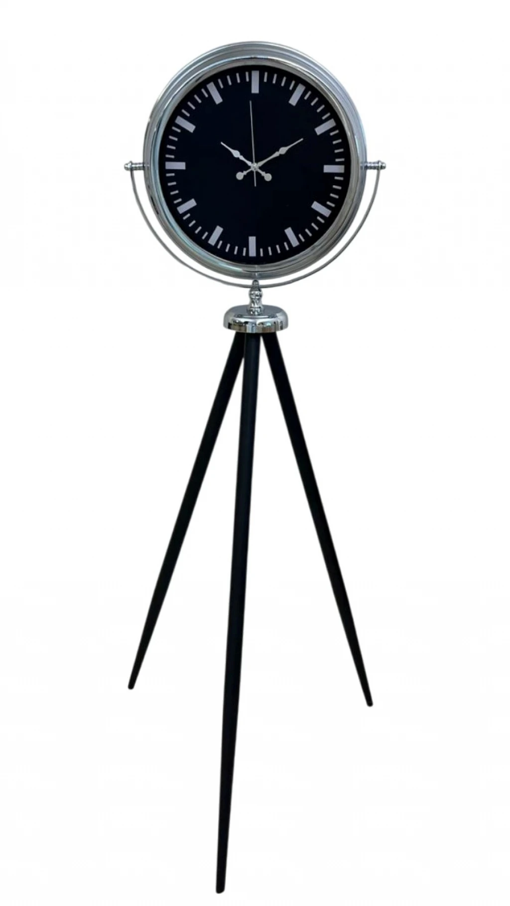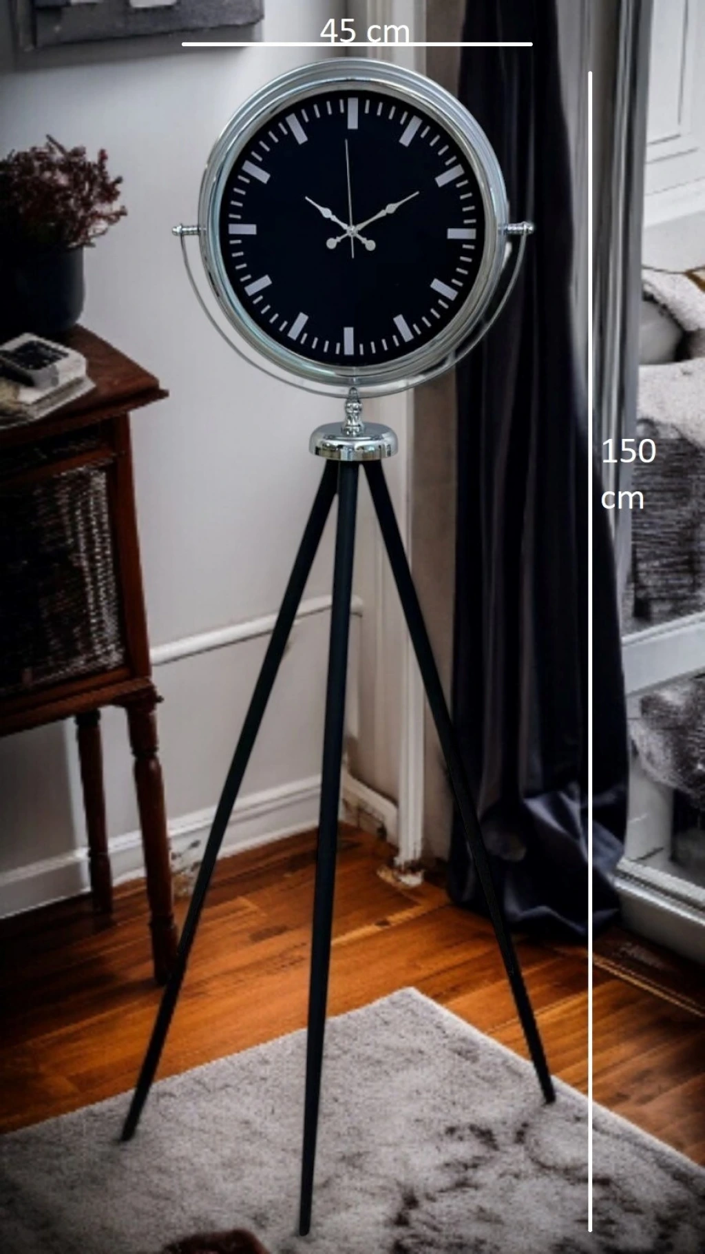 Tripod ayak yapısı, saate dengeli ve sağlam bir duruş kazandırırken siyah ayaklar krom gövdeyle güçlü bir kontrast oluşturur. Salon, ofis, villa, otel lobisi, mağaza ve showroom gibi geniş alanlarda kullanıldığında bulunduğu ortamın havasını tek başına değiştirebilecek etkiye sahiptir.