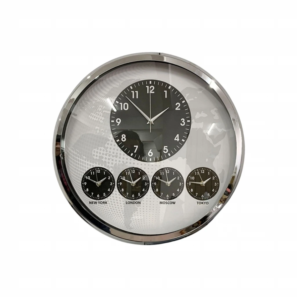 Şık krom metal çerçevesi ve dünya haritası desenli tasarımı ile bu 52 cm duvar saati; modern ofisler, yönetim odaları ve prestijli yaşam alanları için güçlü bir dekoratif tamamlayıcıdır.