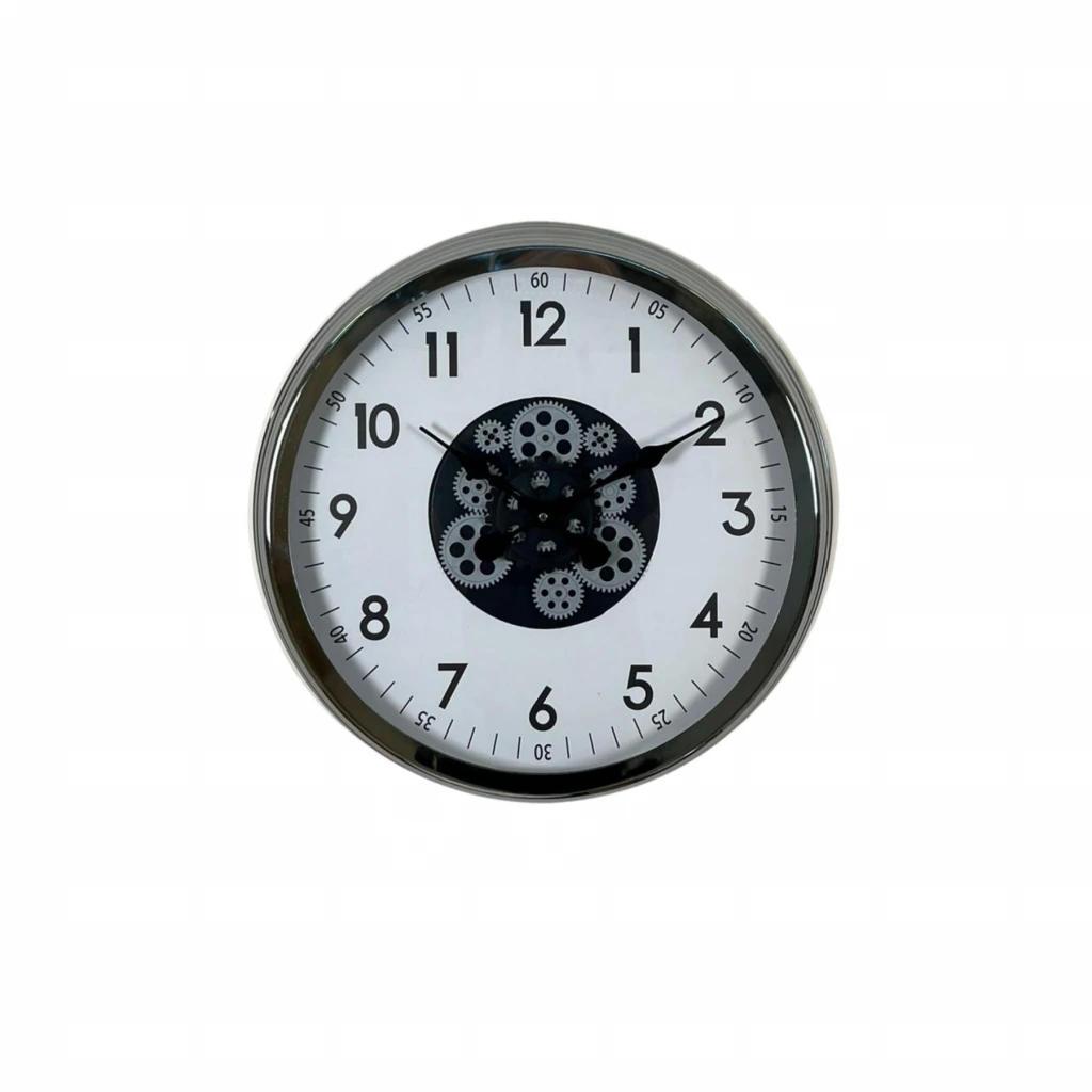 Krom çerçevesi, beyaz zemin üzerindeki net siyah rakamları ve merkezde yer alan hareketli çark tasarımı ile bu 60 cm Çarklı Duvar Saati; modern dekorasyon anlayışını güçlü bir mekanik detayla buluşturur.