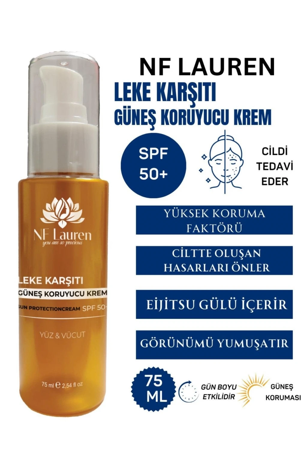 LEKE KARŞITI GÜNEŞ KORUYUCU KREM SPF 50+ Yüksek koruma faktörü sayesinde güneşin zararlı etkilerine karşı cildinizi korumaya yardımcı olur. ; İçerdiği Traneksamik Asit ile UVA, UVB, kirlilik veya çevresel faktörler sebebiyle ciltte oluşan hasarların önlenmesine yardımcı olur. ; Quarcetin içeren Eijitsu Gülü, cilt lekelerinin oluşumunun önlenmesine ve görünümünün yumuşatılmasına yardımcı olur. ; Hyaluronik Asit ve vitaminler ile cildin pürüzsüz bir görünüm kazanmasını ve nemlenmesini destekler. ; Hafif formülü sayesinde mat bir görünüm kazandırmaya, parlamayı azaltmaya yardımcı olur. ; Gün boyu sağlıklı ve güzel bir cilt görünümü sağlar. ; Kullanım Şekli/Use: Güneşe çıkmadan 15-20 dakika önce uygulayınız. ; Yüzme, aşırı terleme ve kurulama gibi aktivitelerden sonra tekrarlayınız. ; Avrupa otoritelerinin tavsiyelerine göre güneş koruyucular 2 saatte bir uygulanmalıdır. ; Uyarılar/Warnings: Güneşten koruyucu ürün kullanıldığında dahi güneşte çok uzun süre kalmayınız. ; Güneşe çıkmadan en az 20 dk önce cilde bol miktarda uygulayınız. ; En az 2 saatte bir uygulamayı tekrarlayınız. ; Ürünü gözaltı ve üst (kapak) bölgesine uygulamayınız. ; Ürünün gözün iç kısmı ile temasından kaçınınız, teması durumunda bol su ile yıkayınız. ; Ürün kullanımı ile meydana gelebilecek istenmeyen bir etkiyle karşılaşılması durumunda doktora danışınız. ; Ürünü küçük çocukların ulaşamayacağı yerde saklayınız. ; Yutulması durumunda doktora başvurunuz. ; Ürünü güneş ışığına maruz bırakmayınız, aşırı sıcaktan koruyunuz. ; İçindekiler/Ingredients: Aqua, Homosalate, Octocrylene, Diisopropyl Adipate, C12-15 Alkyl Benzoate, *Aloe Barbadensis Leaf Juice, Glyceryl Stearate, PEG-100 Stearate, *Butyrospermum Parkii Butter, Bis-Ethylhexyloxyphenol Methoxyphenyl Triazine, Butyl Methoxydibenzoylmethane, Ethylhexyl Salicylate, Niacinamide, Cetearyl Alcohol, Ceteareth-25, Dimethicone/Vinyl Dimethicone Crosspolymer, Potassium Cetyl Phosphate, Dimethicone, Glycerin, Phenoxyethanol, Triacontanyl PVP, Rosa Multiflora Fruit Extract, Tocopheryl Acetate, Panthenol, Cetyl Palmitate, Ceteareth-12, Ceteareth-20, Allantoin, Acrylates/C10-30 Alkyl Acrylate Crosspolymer, Tranexamic Acid, Sodium Hyaluronate, Xanthan Gum, Triethanolamine, Citric Acid, Caprylyl Glycol, Potassium Sorbate, Sodium Benzoate. ; *Organik&Ecocert Sertifikalı bileşen;