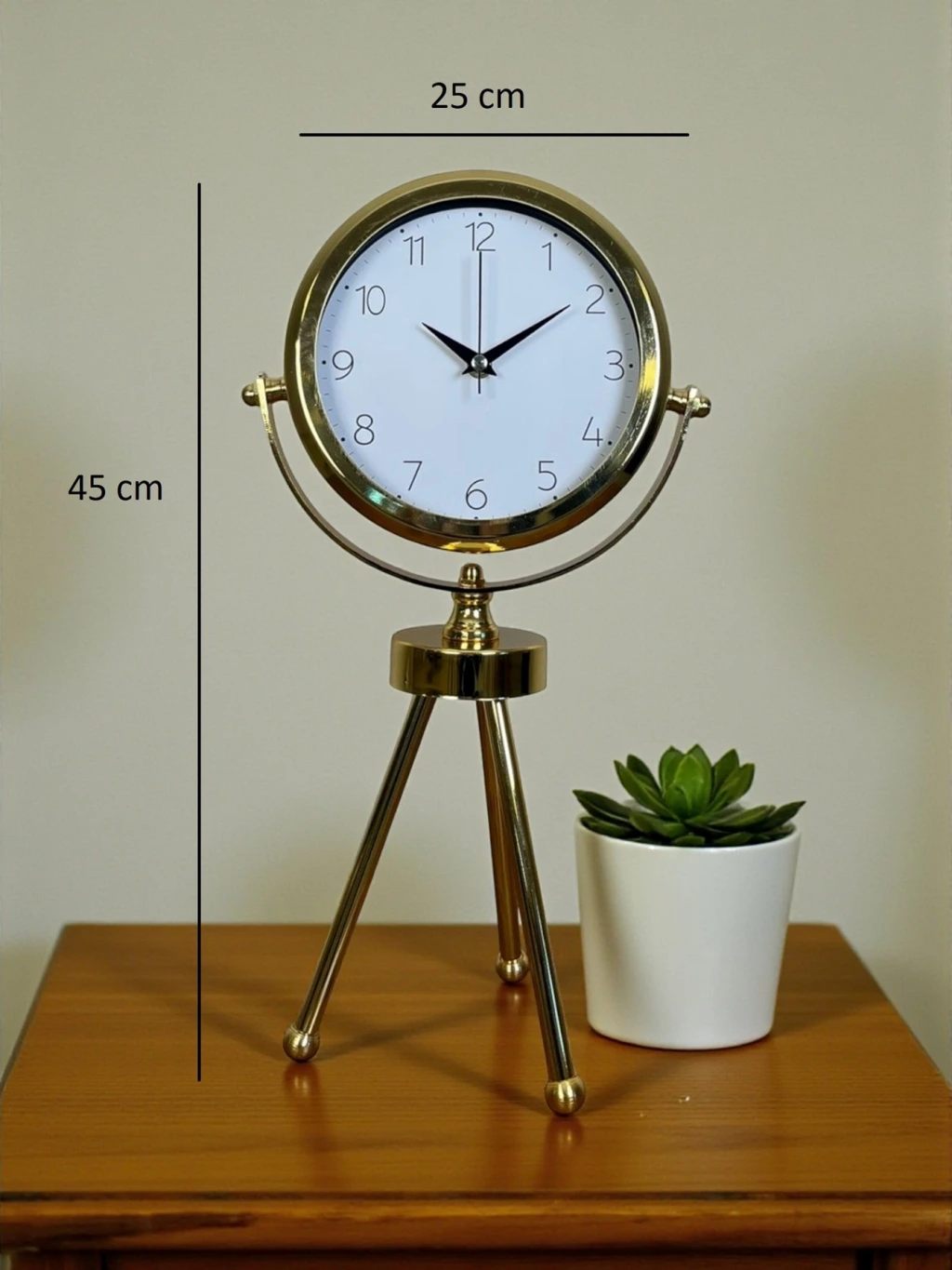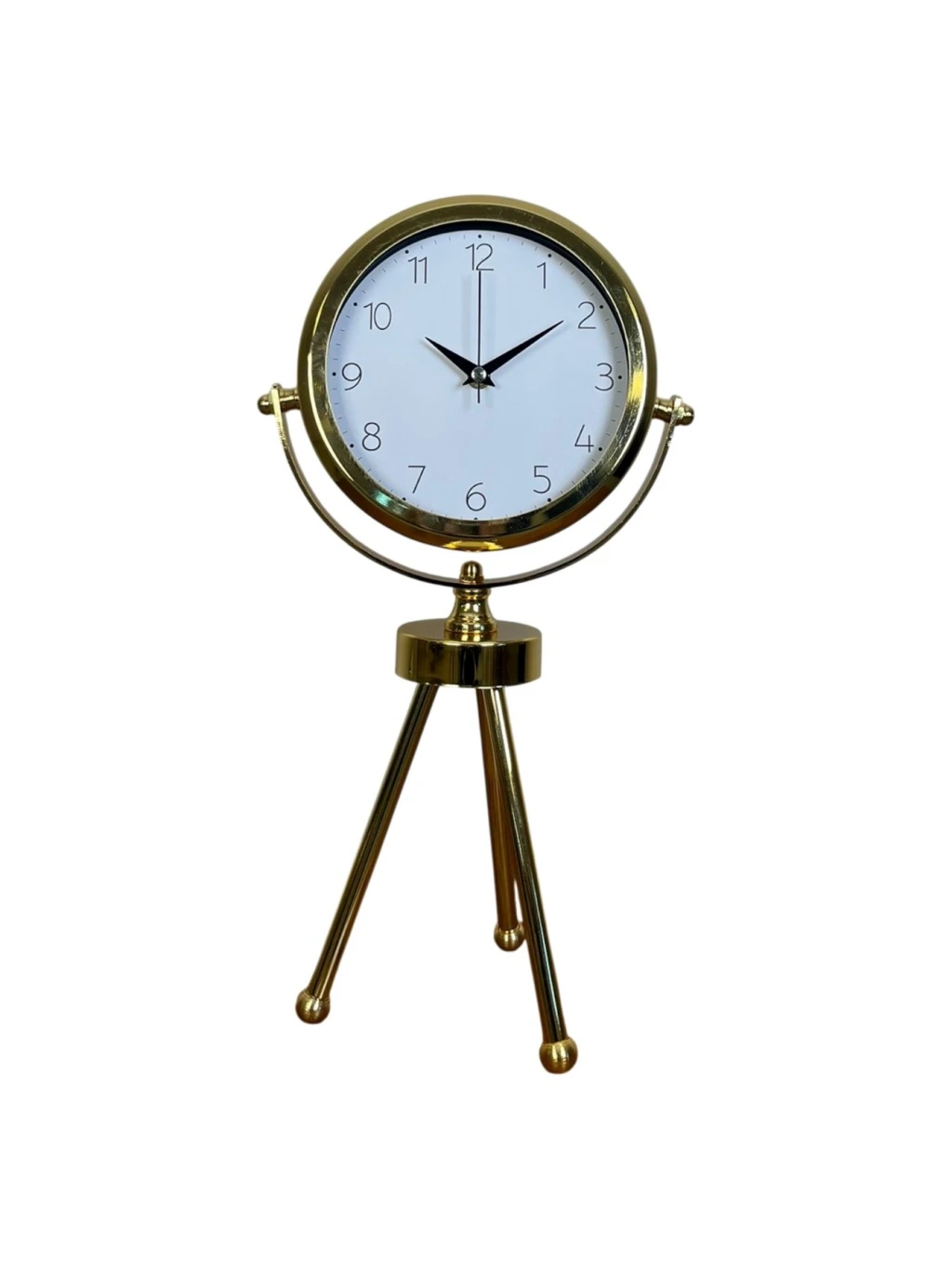 Zarif gold kaplamalı metal gövdesi ve üç ayaklı tripod tasarımıyla dikkat çeken bu masa saati, dekorasyonuna şık bir dokunuş katmak isteyenler için özel olarak tasarlanmıştır. Modern çizgilerle klasik şıklığı bir araya getiren gold parlak yüzeyi, hem estetik hem de dayanıklı bir kullanım sunar.