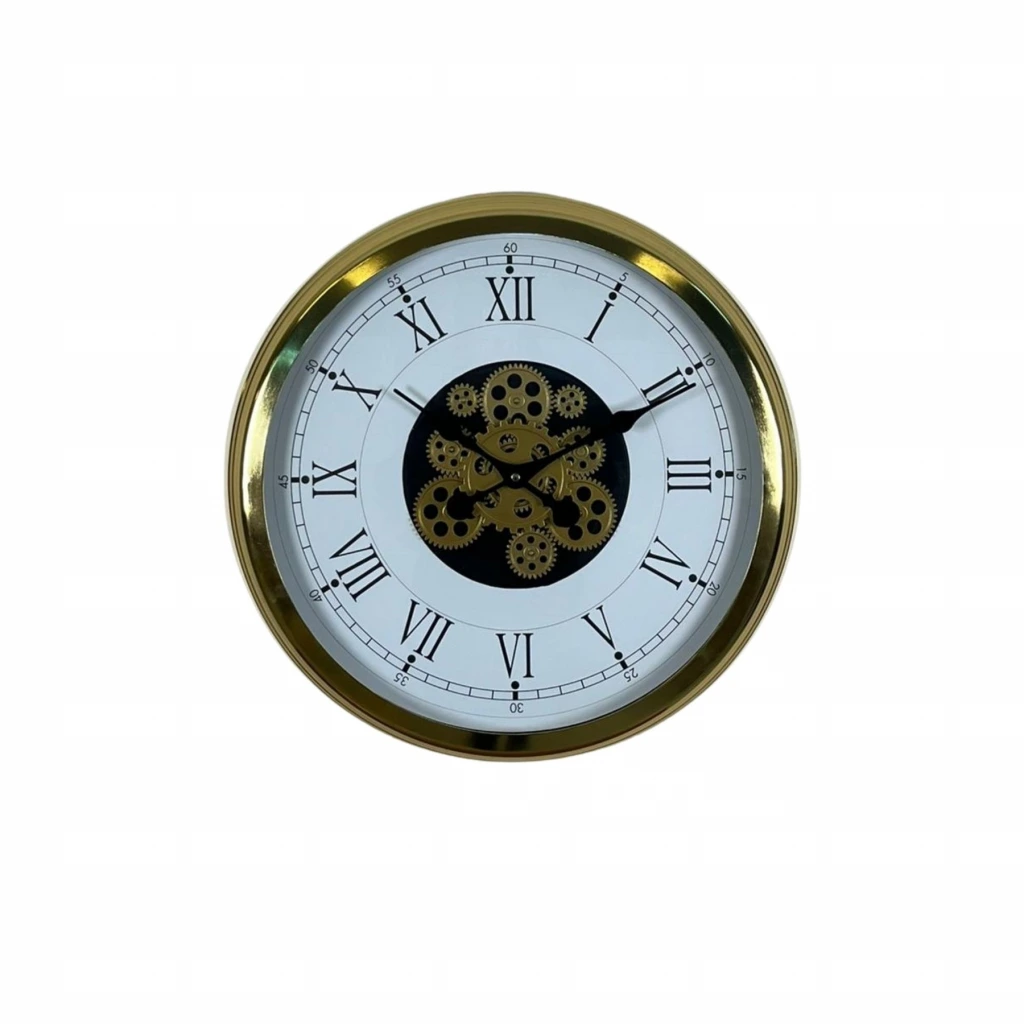 Beyaz zemin üzerine siyah Roma rakamlar klasik şıklığı yansıtırken, altın tonlu mekanik çark detayı ürüne lüks ve karakterli bir görünüm kazandırır. Modern ve klasik dekorasyon stilleriyle mükemmel uyum sağlar.