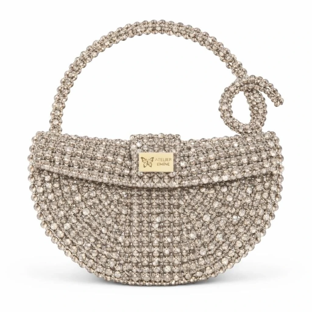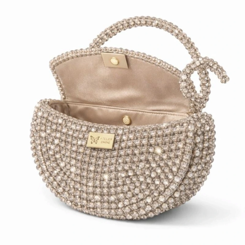 Atelier Emine’in Crystal Gelato Couture serisine ait Melo Cremino, 8 mm optik sınıfı kristal boncukların yüksek dayanımlı misina ile örülmesiyle tamamen el işçiliğiyle üretilmiş, yarım ay formunda premium mini çanta modelidir.