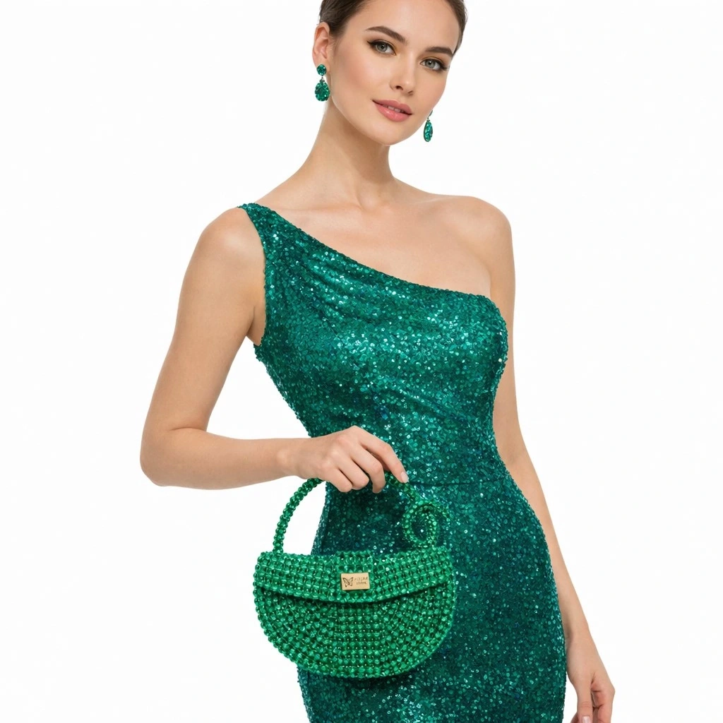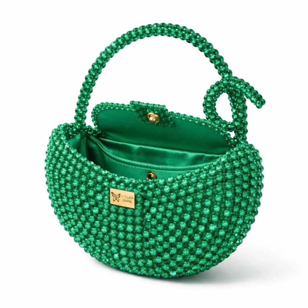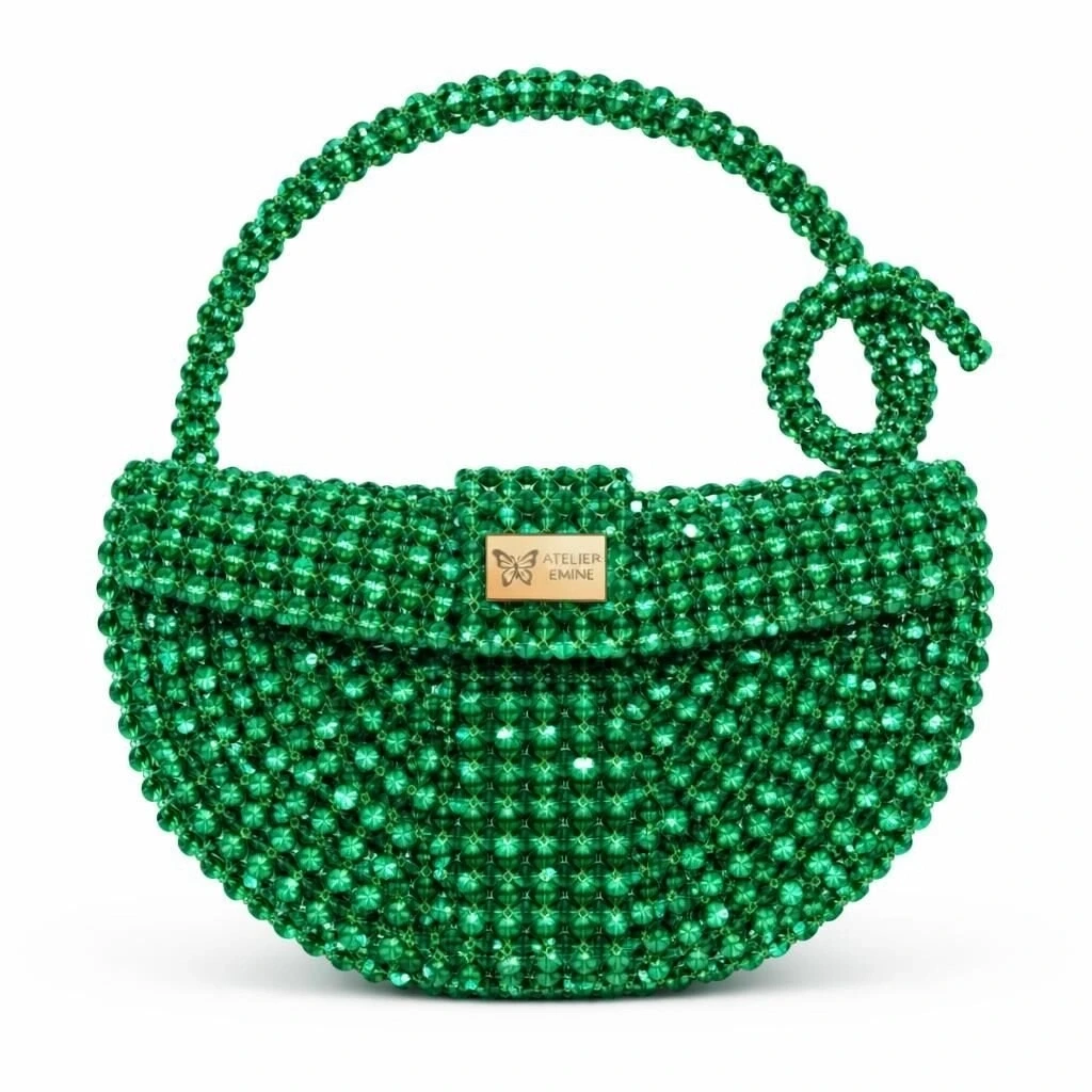 Atelier Emine’in Crystal Gelato Couture serisine ait Melo Menta, 8 mm optik sınıfı kristal boncukların yüksek dayanımlı misina ile örülmesiyle tamamen el işçiliğiyle üretilmiş, yarım ay formunda premium mini çanta modelidir.