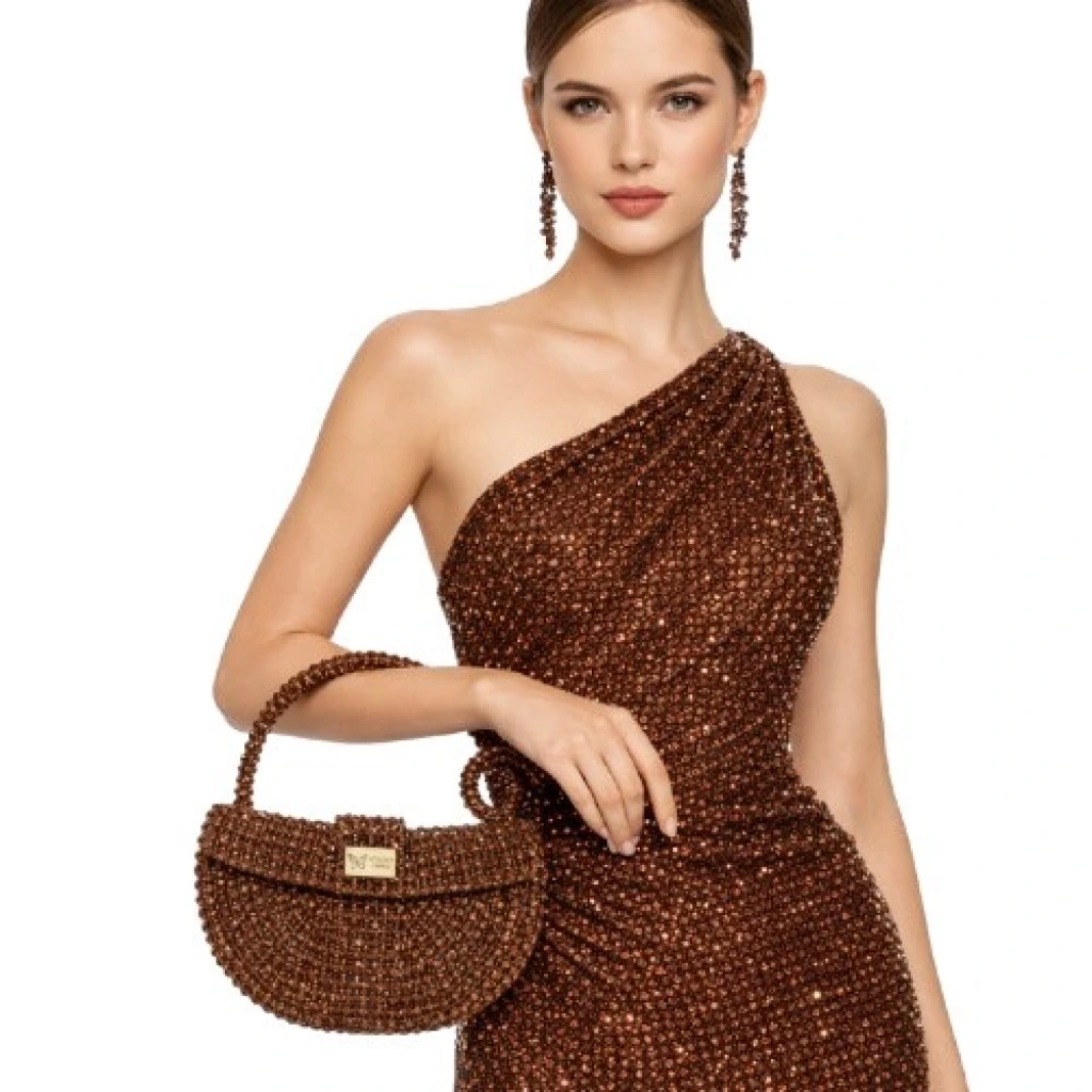 Atelier Emine’in Crystal Gelato Couture serisine ait Melo Nocciola, 8 mm optik sınıfı kristal boncukların yüksek dayanımlı misina ile örülmesiyle tamamen el işçiliğiyle üretilmiş, yarım ay formunda premium mini çanta modelidir.
