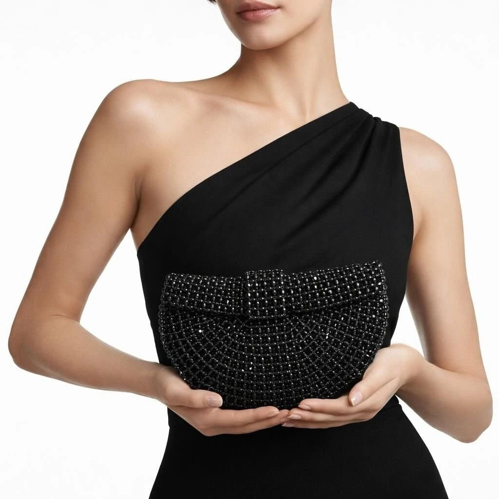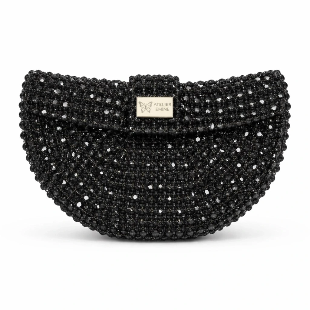 Atelier Emine’in Crystal Gelato Couture serisine ait Melo Nyx, 8 mm optik sınıfı kristal boncukların yüksek dayanımlı misina ile örülmesiyle tamamen el işçiliğiyle üretilmiş, yarım ay formunda premium mini çanta modelidir.