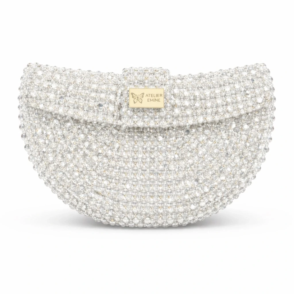Atelier Emine’in Crystal Gelato Couture serisine ait Melo Pearl, 8 mm optik sınıfı kristal boncukların yüksek dayanımlı misina ile örülmesiyle tamamen el işçiliğiyle üretilmiş, yarım ay formunda premium mini çanta modelidir.