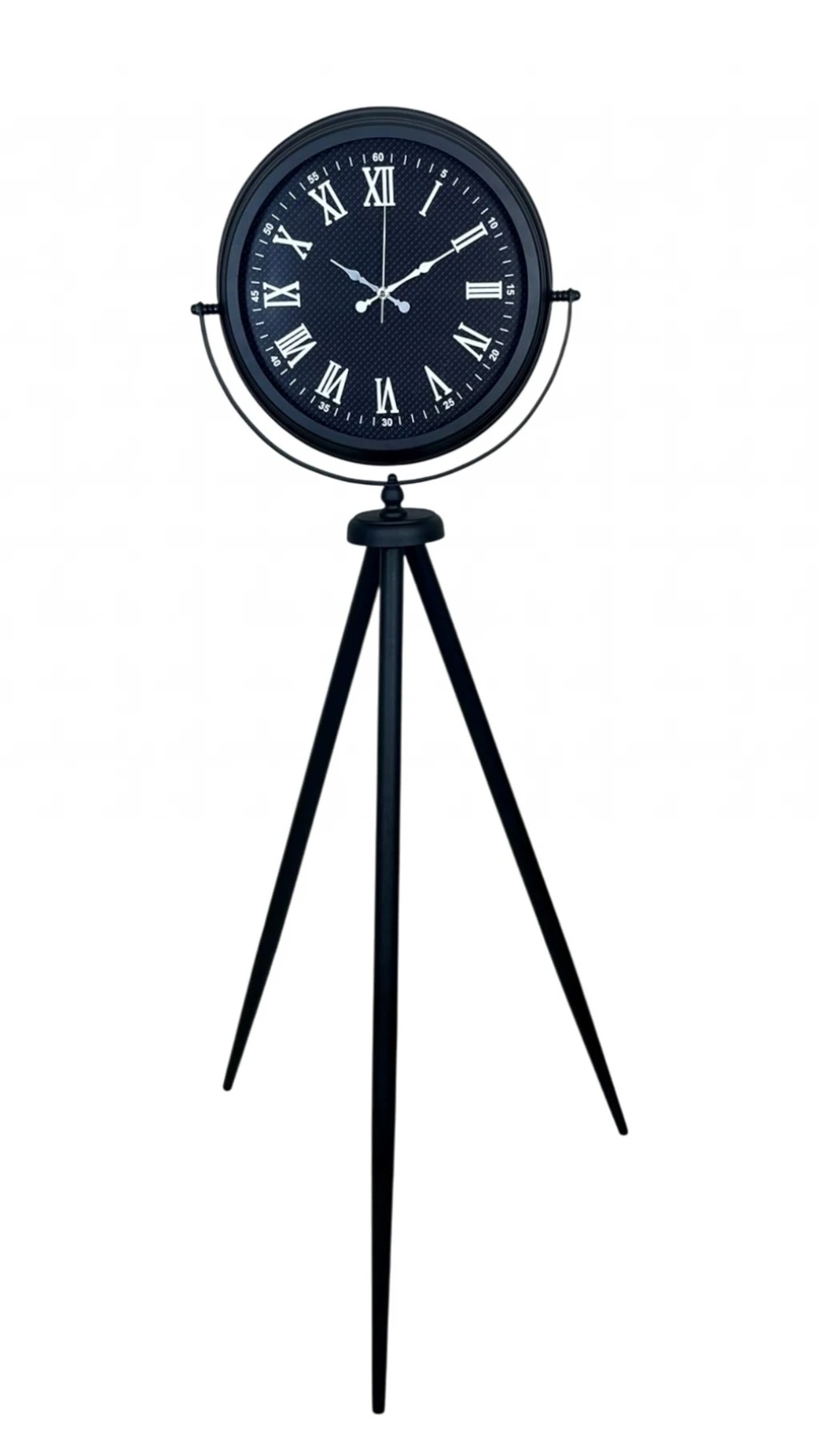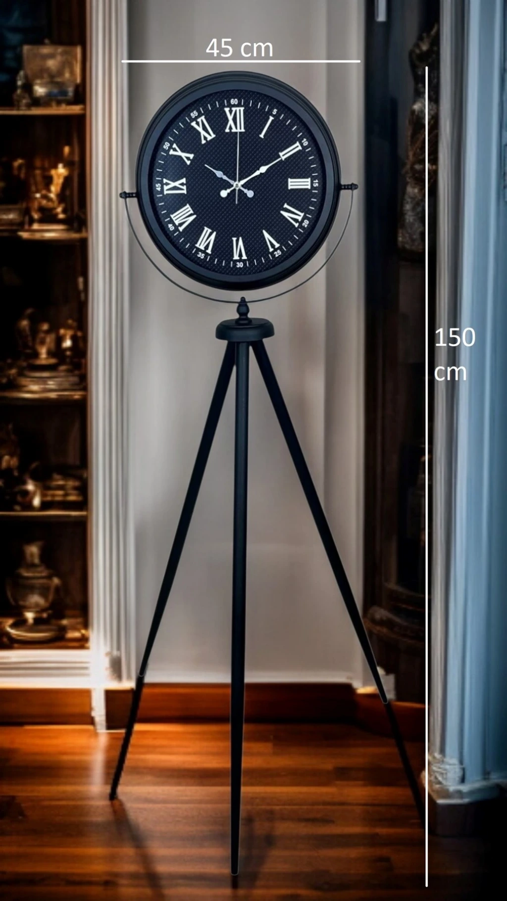 Bulunduğu ortama güçlü bir karakter ve premium bir şıklık kazandıran Siyah Tripod Ayaklı Dekoratif Salon Saati, 150 x 45 cm ölçüsüyle geniş yaşam alanlarında dikkat çeken bir dekor parçasıdır. Siyah metal tripod ayak tasarımı modern, loft ve endüstriyel dekorasyonlara kusursuz uyum sağlarken; siyah kadran üzerindeki Roma rakamları saate zamansız ve seçkin bir görünüm kazandırır. Bu özel tasarım sadece zamanı göstermekle kalmaz; salonun şık bir köşesinde, antre girişinde, ofis resepsiyonunda veya mağaza vitrininde “vitrin etkisi” yaratarak dekorun odak noktası olur.