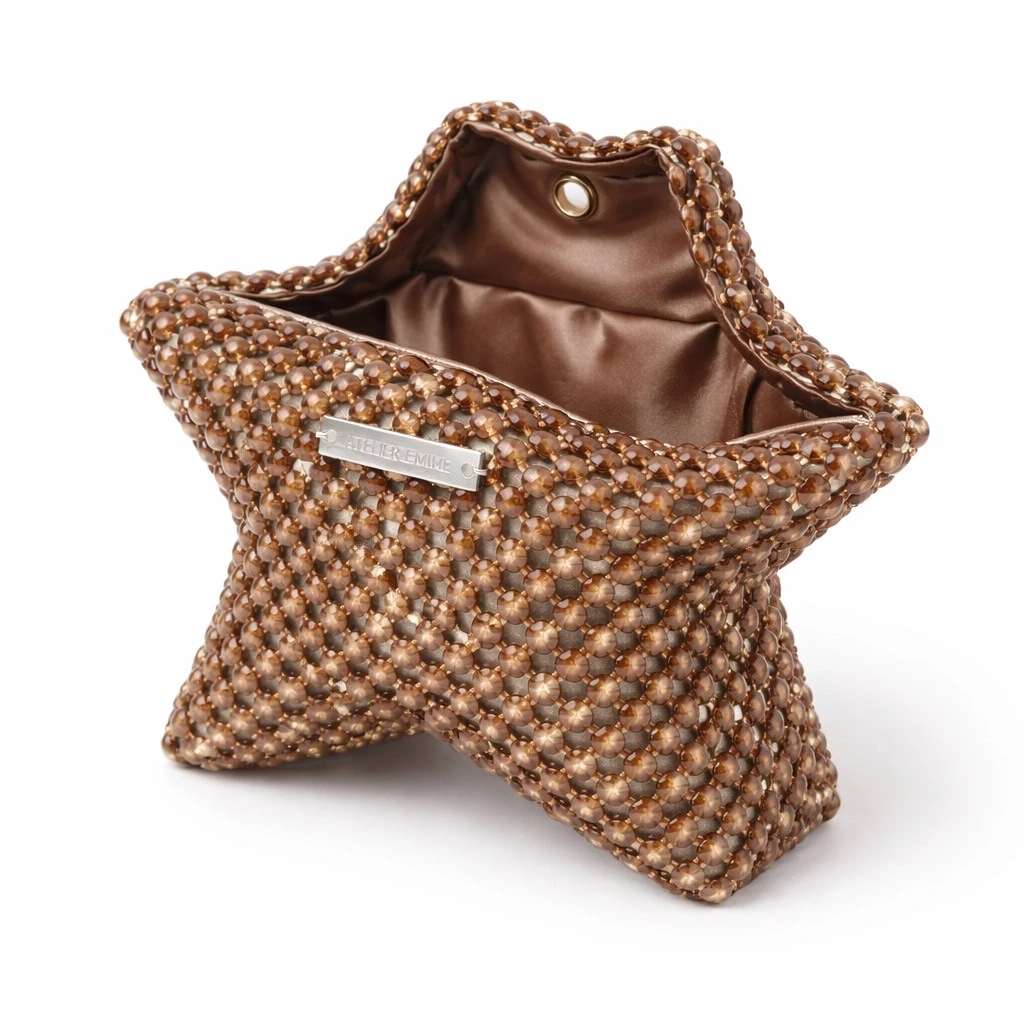 Atelier Emine’in Crystal Gelato Couture serisine ait Mielo Castagna, üç boyutlu yıldız formu esas alınarak tasarlanmış; 8 mm optik sınıfı kristal boncukların yüksek dayanımlı misina ile tek tek örülmesiyle üretilmiş, heykelsi nitelik taşıyan premium mini clutch modelidir.