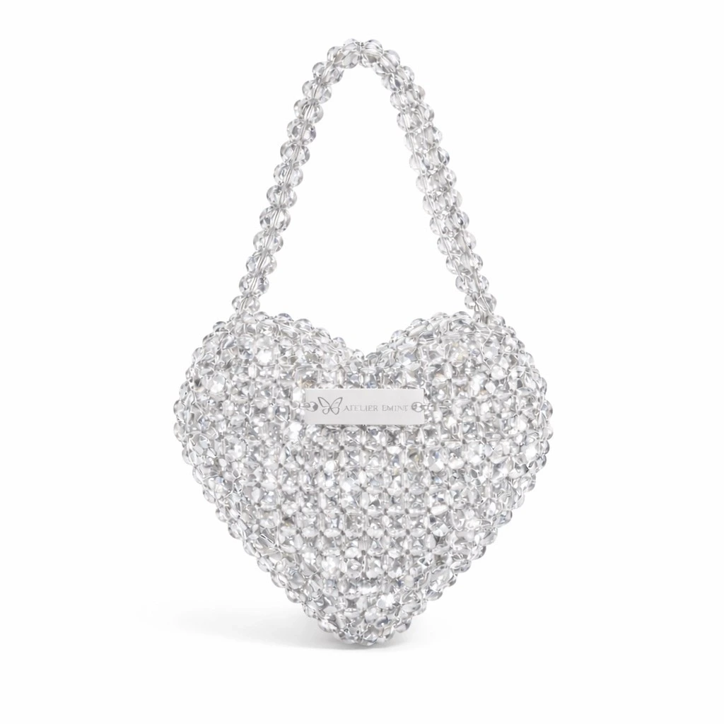 Atelier Emine’in Crystal Gelato Couture serisine ait Mielo Grigio, 8 mm optik sınıfı kristal boncuklar ve üst taşıma kulpu kullanılarak tamamen el işçiliğiyle üretilmiş heykelsi formda premium mini çanta modelidir.