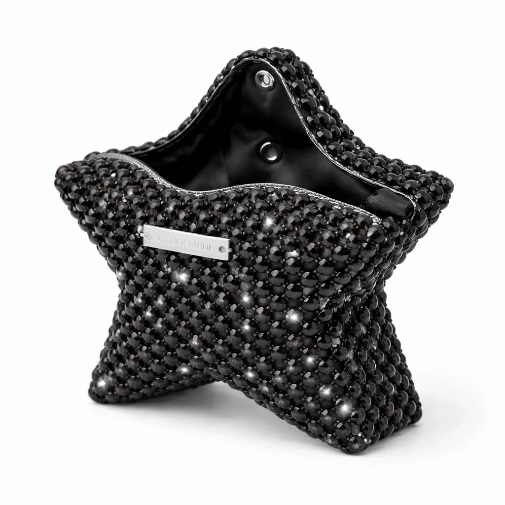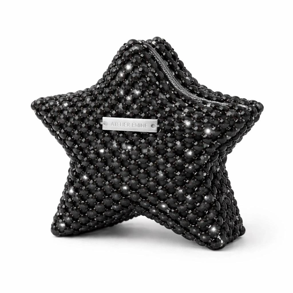 Atelier Emine’in Crystal Gelato Couture serisine ait Mielo Liquirizia, üç boyutlu yıldız formu esas alınarak tasarlanmış; 8 mm optik sınıfı kristal boncukların yüksek dayanımlı misina ile tek tek örülmesiyle üretilmiş, heykelsi nitelik taşıyan premium mini clutch modelidir.