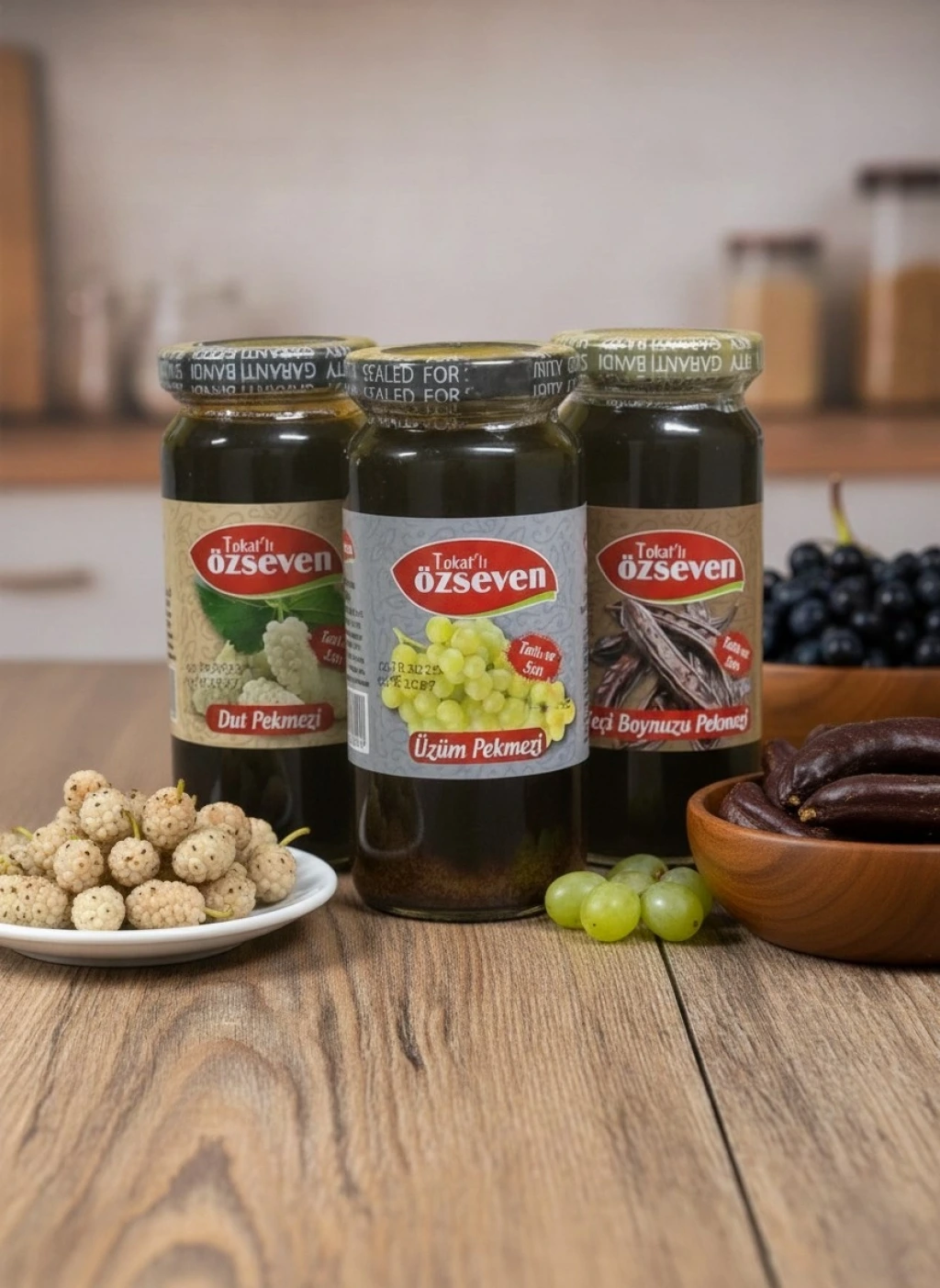 Özseven’in geleneksel üretim anlayışıyla hazırlanan Üzüm Pekmezi, Dut Pekmezi ve Keçiboynuzu Pekmezi, yoğun kıvamı ve doğal lezzetiyle sofralarınıza gelir. Özenle seçilen meyveler, geleneksel yöntemlerle işlenerek kendine özgü aromasını ve doğallığını korur.