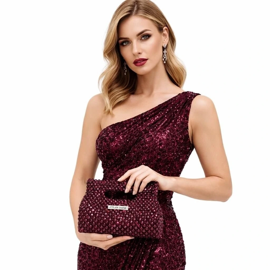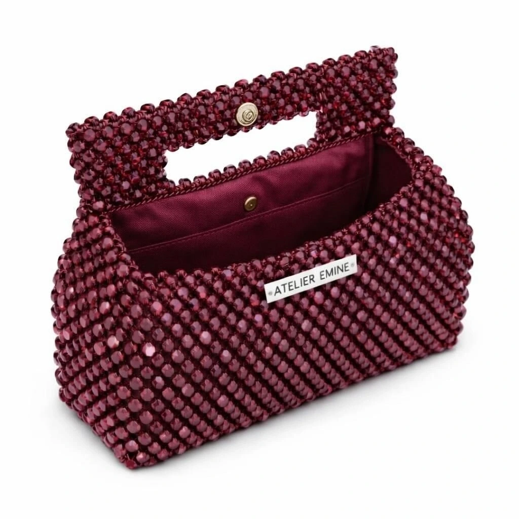 Atelier Emine’in Crystal Gelato Couture serisine ait Panna Cranberry, 8 mm optik sınıfı kristal boncukların yüksek dayanımlı misina ile tek tek örülmesiyle üretilmiş, formu gövdeyle bütünleşik top-handle yapıya sahip premium clutch modelidir.