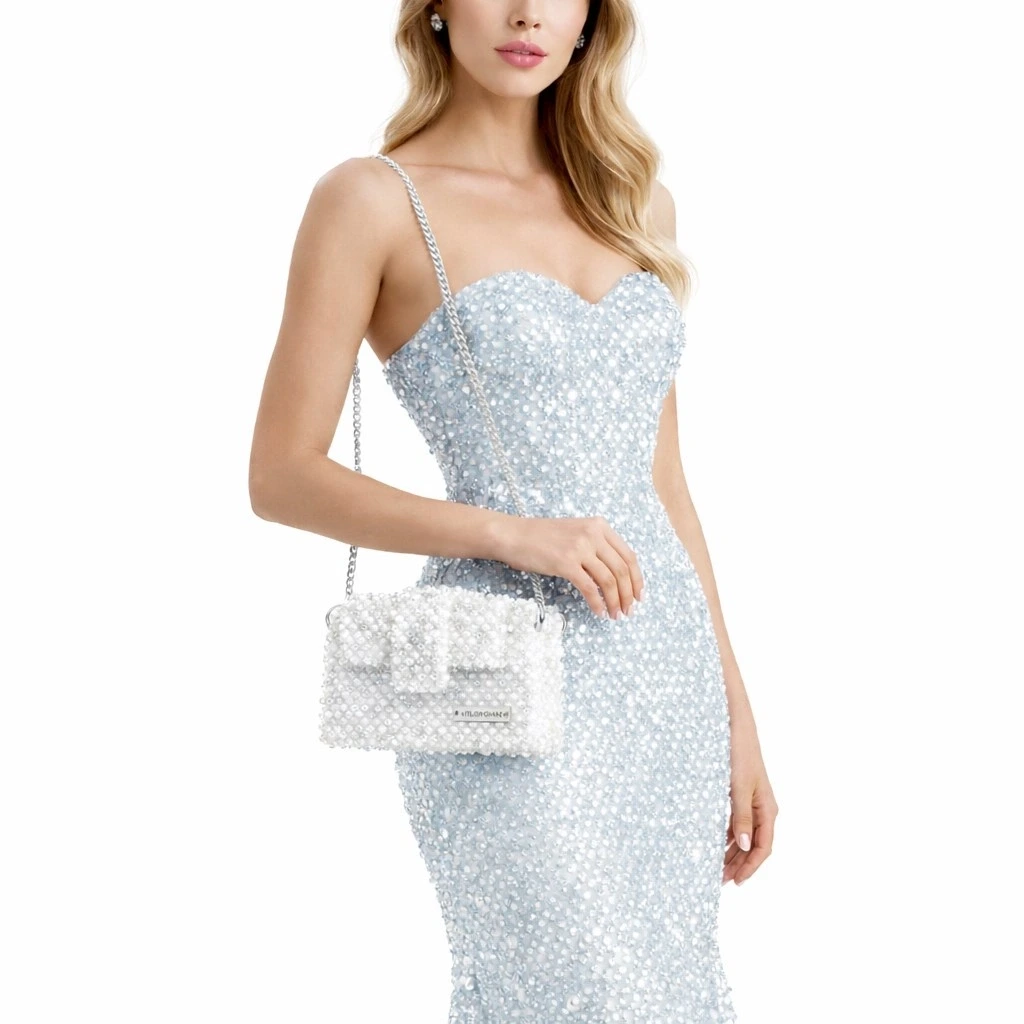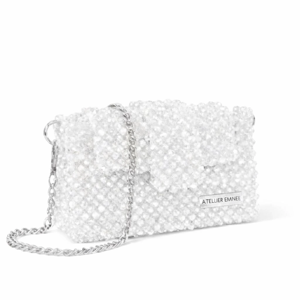 Atelier Emine’in Crystal Gelato Couture serisine ait Panna Marble, 8 mm optik sınıfı kristal boncuklar, metal omuz zinciri ve saten astar kullanılarak tamamen el işçiliğiyle üretilmiş premium clutch modelidir.