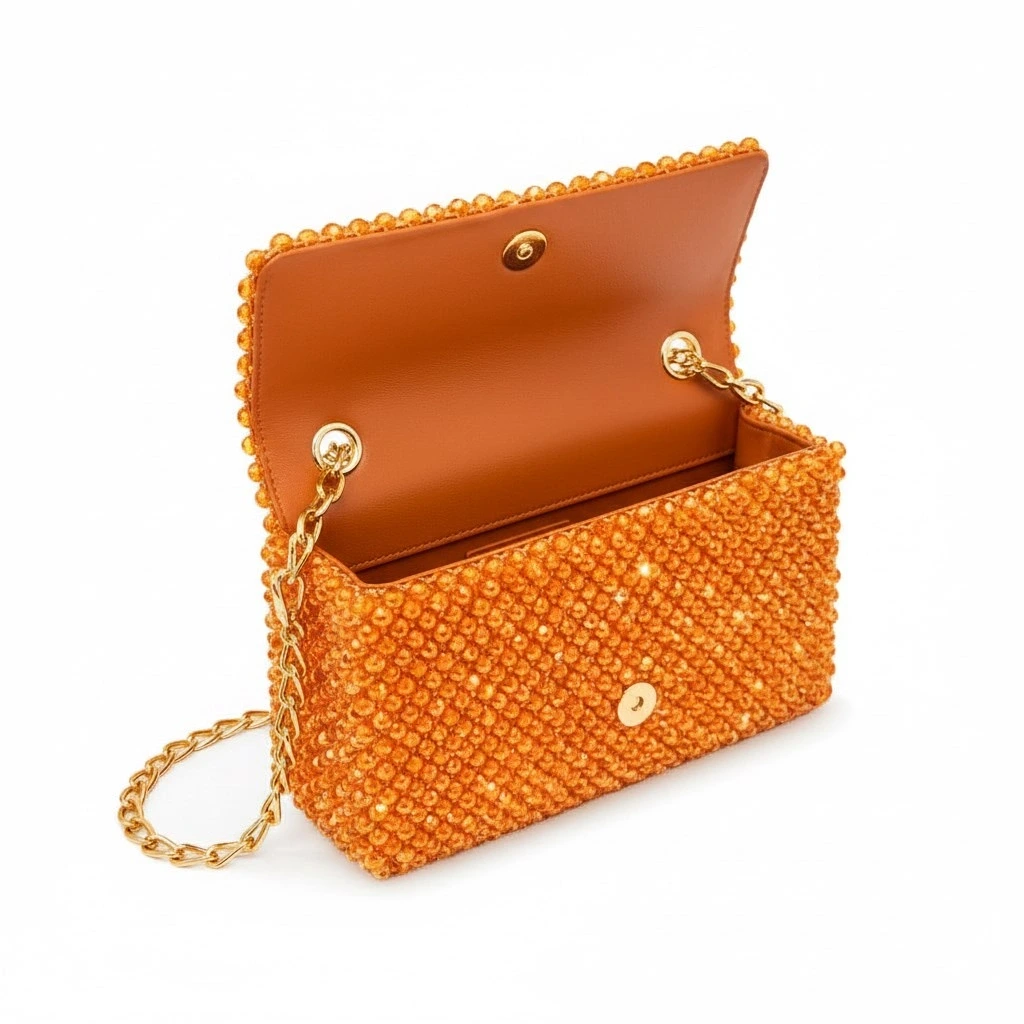 Atelier Emine’in Crystal Gelato Couture serisine ait Panna Papaya, 8 mm optik sınıfı kristal boncuklar, metal omuz zinciri ve saten astar kullanılarak tamamen el işçiliğiyle üretilmiş premium clutch modelidir.