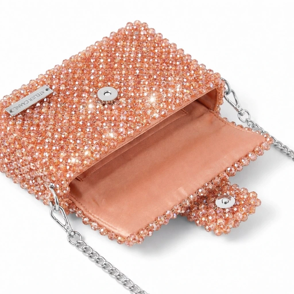 Atelier Emine’in Crystal Gelato Couture serisine ait Panna Petal, 8 mm optik sınıfı kristal boncuklar, metal omuz zinciri ve saten astar kullanılarak tamamen el işçiliğiyle üretilmiş premium clutch modelidir.