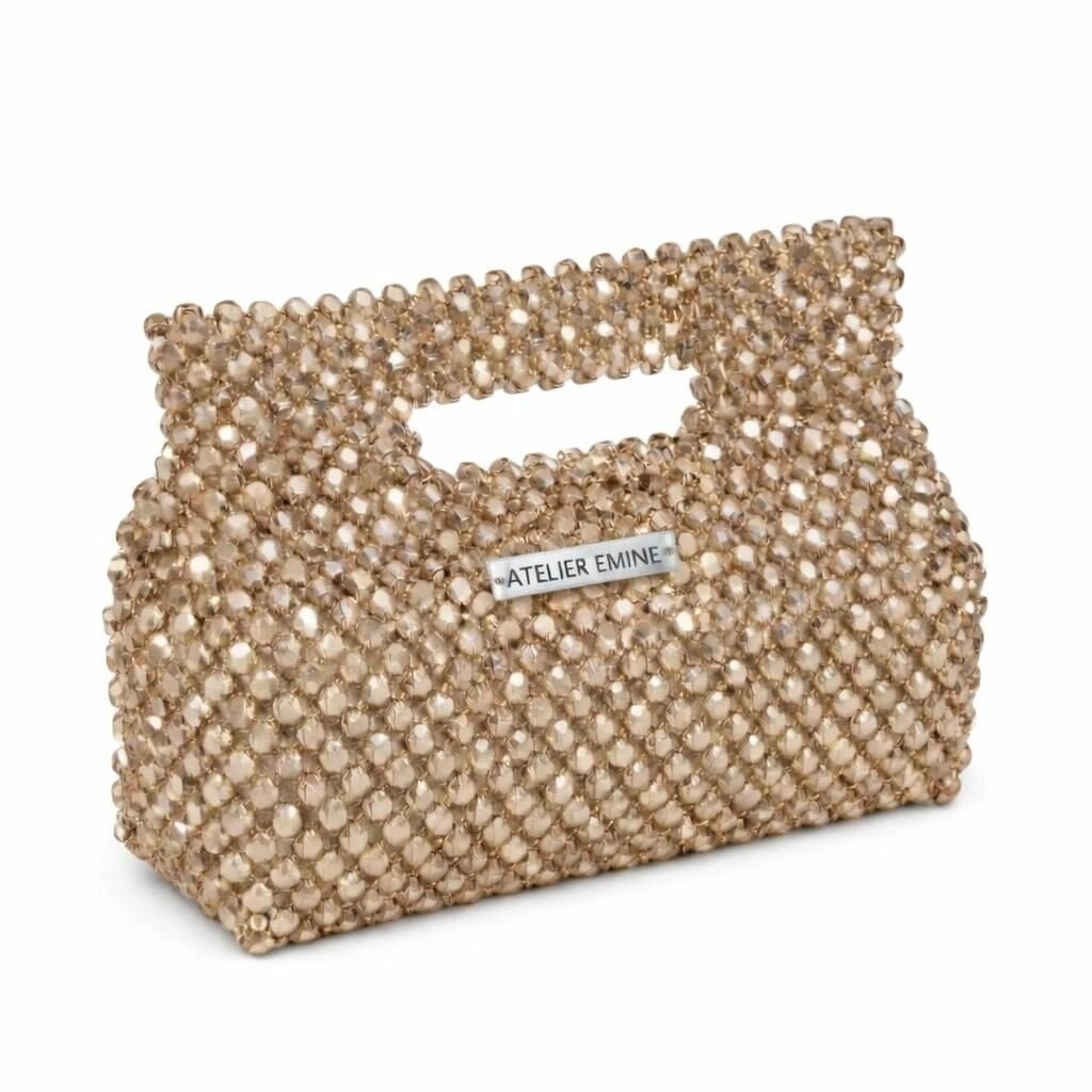 Atelier Emine’in Crystal Gelato Couture serisine ait Panna Sand, 8 mm optik sınıfı kristal boncukların yüksek dayanımlı misina ile tek tek örülmesiyle üretilmiş, formu gövdeyle bütünleşik top-handle yapıya sahip premium clutch modelidir.