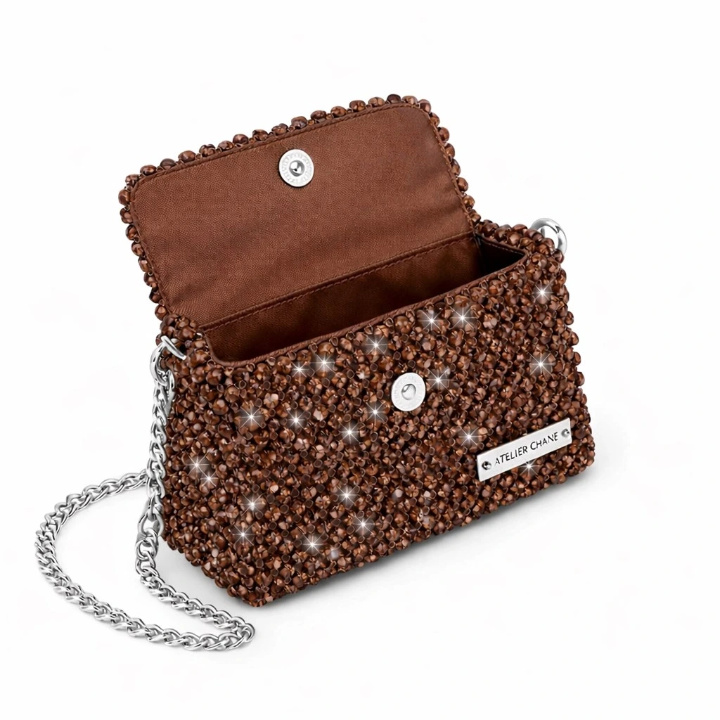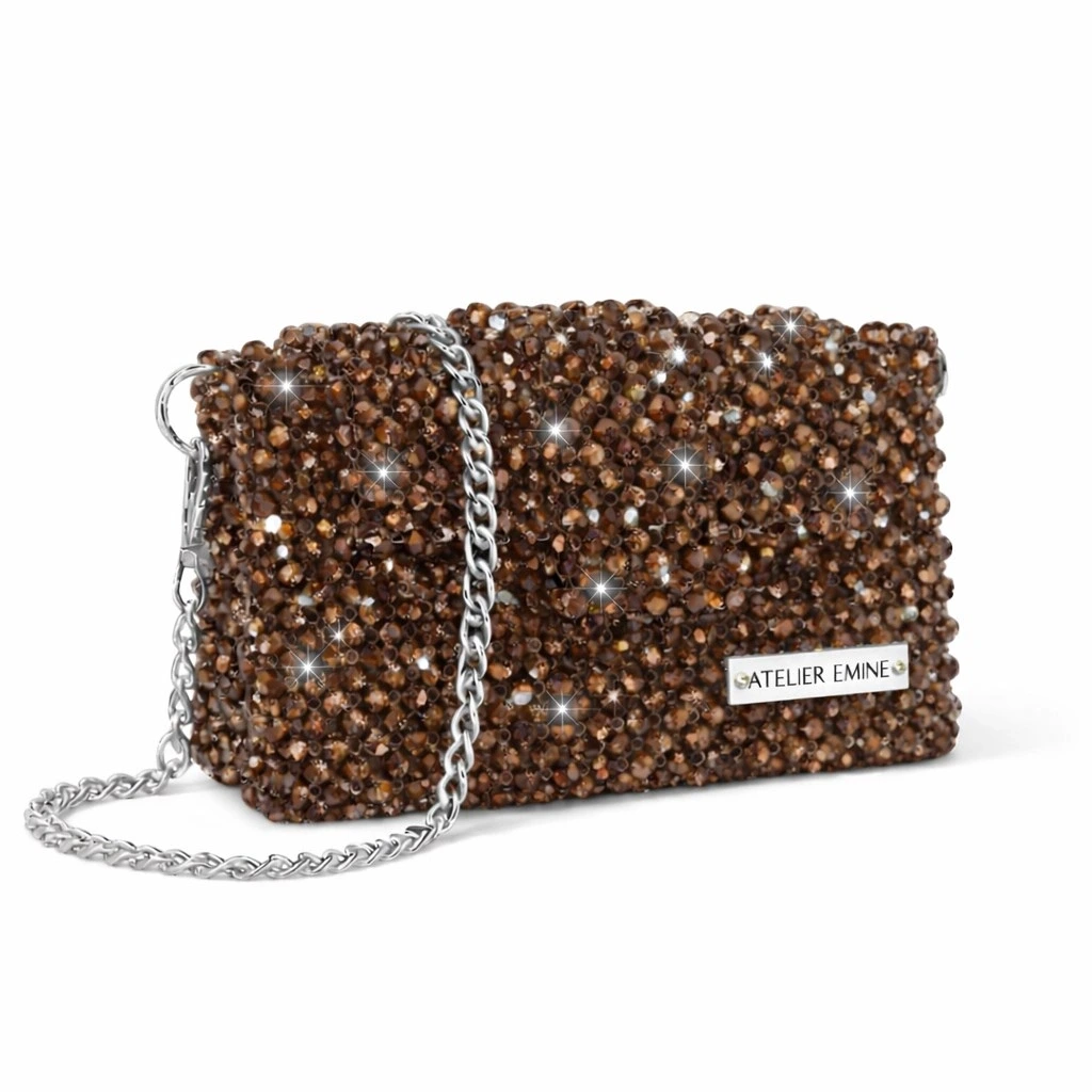Atelier Emine’in Crystal Gelato Couture serisine ait Panna Savana, 8 mm optik sınıfı kristal boncuklar, metal omuz zinciri ve saten astar kullanılarak tamamen el işçiliğiyle üretilmiş premium clutch modelidir.