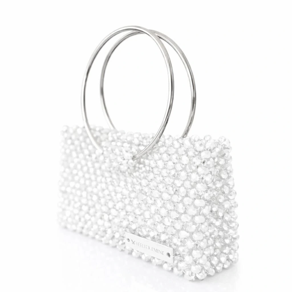 Atelier Emine’in Crystal Gelato Couture serisine ait Panna Silk, 8 mm optik sınıfı kristal boncuklar, çift metal halka kulp ve saten astar kullanılarak tamamen el işçiliğiyle üretilmiş premium top-handle çanta modelidir.