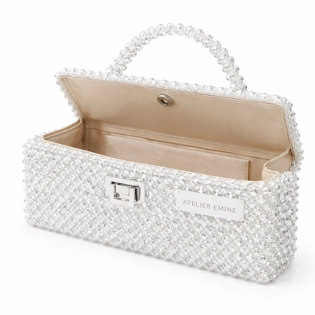Atelier Emine’in Crystal Gelato Couture serisine ait Panna Silver, 8 mm optik sınıfı kristal boncuklar, üst taşıma kulpu, metal kilit mekanizması ve saten astar kullanılarak tamamen el işçiliğiyle üretilmiş premium top-handle clutch modelidir.