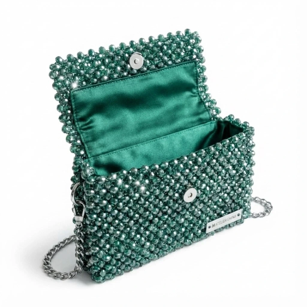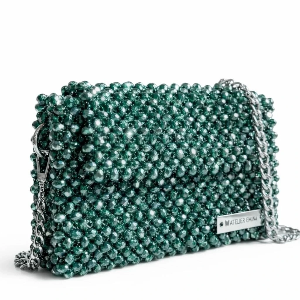 Atelier Emine’in Crystal Gelato Couture koleksiyonuna ait Panna Verde, 8 mm optik sınıfı kristal boncukların yüksek dayanımlı misina ile tek tek örülmesiyle üretilmiş, dikdörtgen formlu premium mini çanta modelidir.