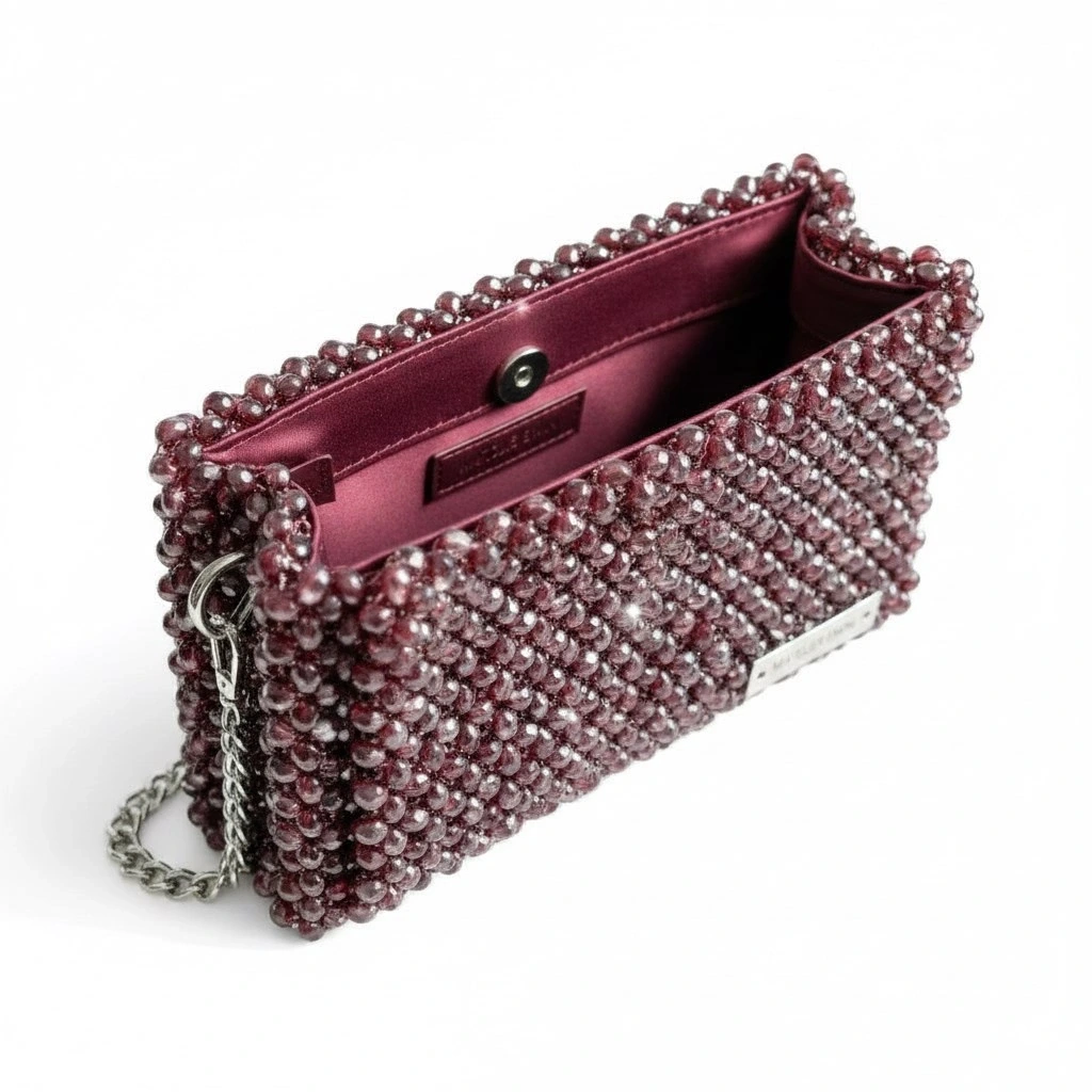 Atelier Emine’in Crystal Gelato Couture koleksiyonuna ait Panna Vino, 8 mm optik sınıfı kristal boncukların yüksek dayanımlı misina ile tek tek örülmesiyle üretilmiş, dikdörtgen formlu premium mini çanta modelidir.