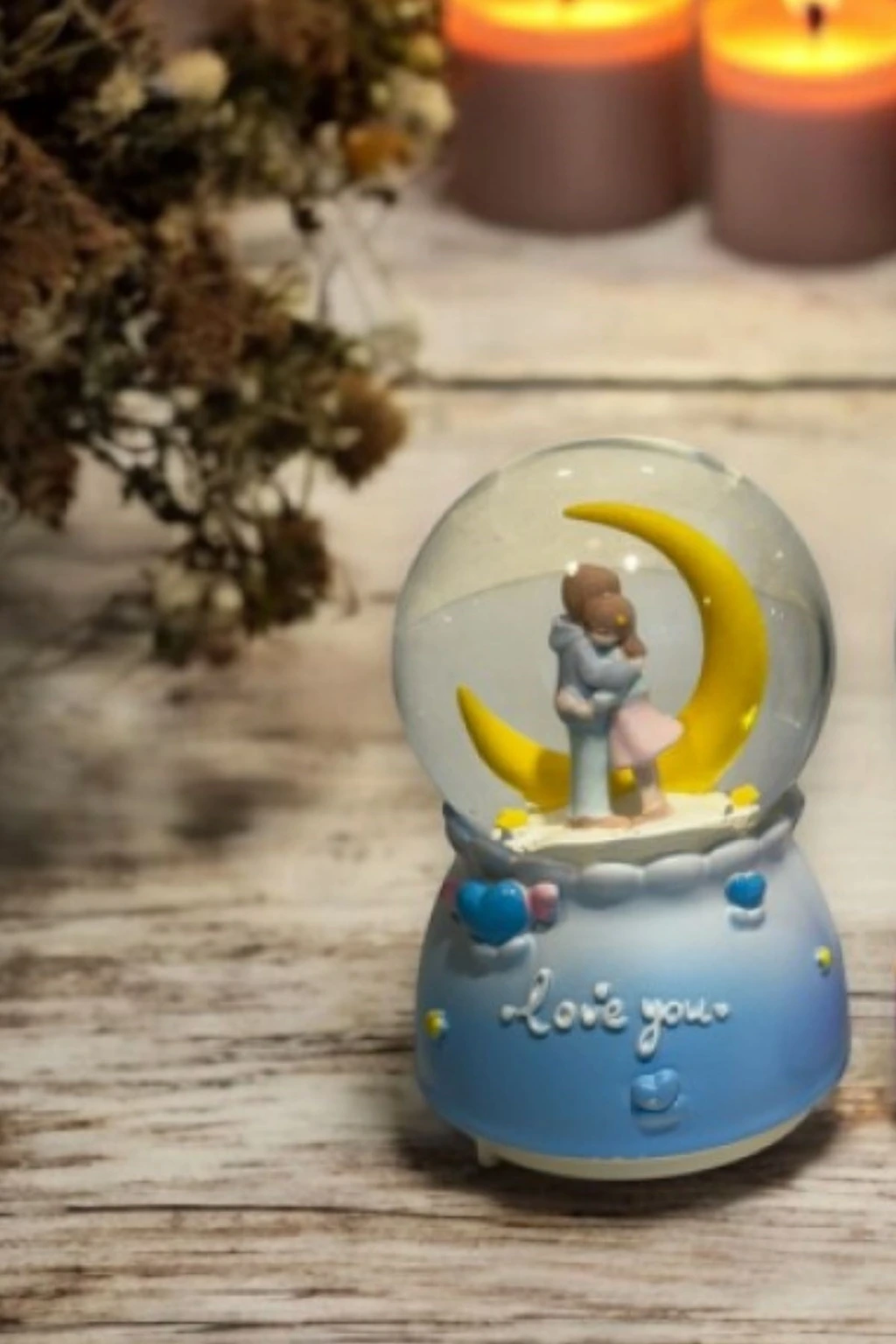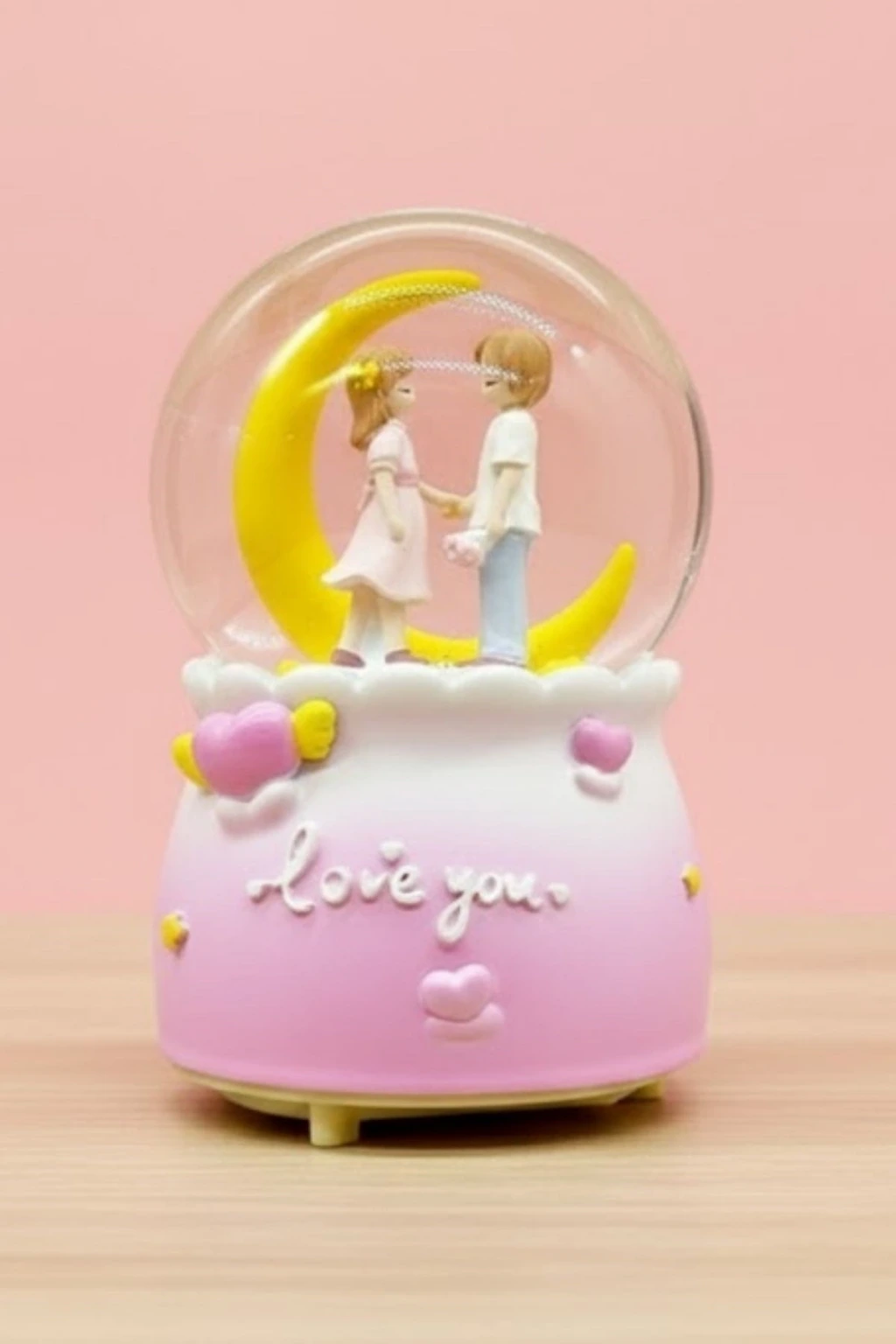 Pilli Işıklı Müzikli Kar Küresi – Hilal Ay Figürlü Romantik Masaüstü Biblo