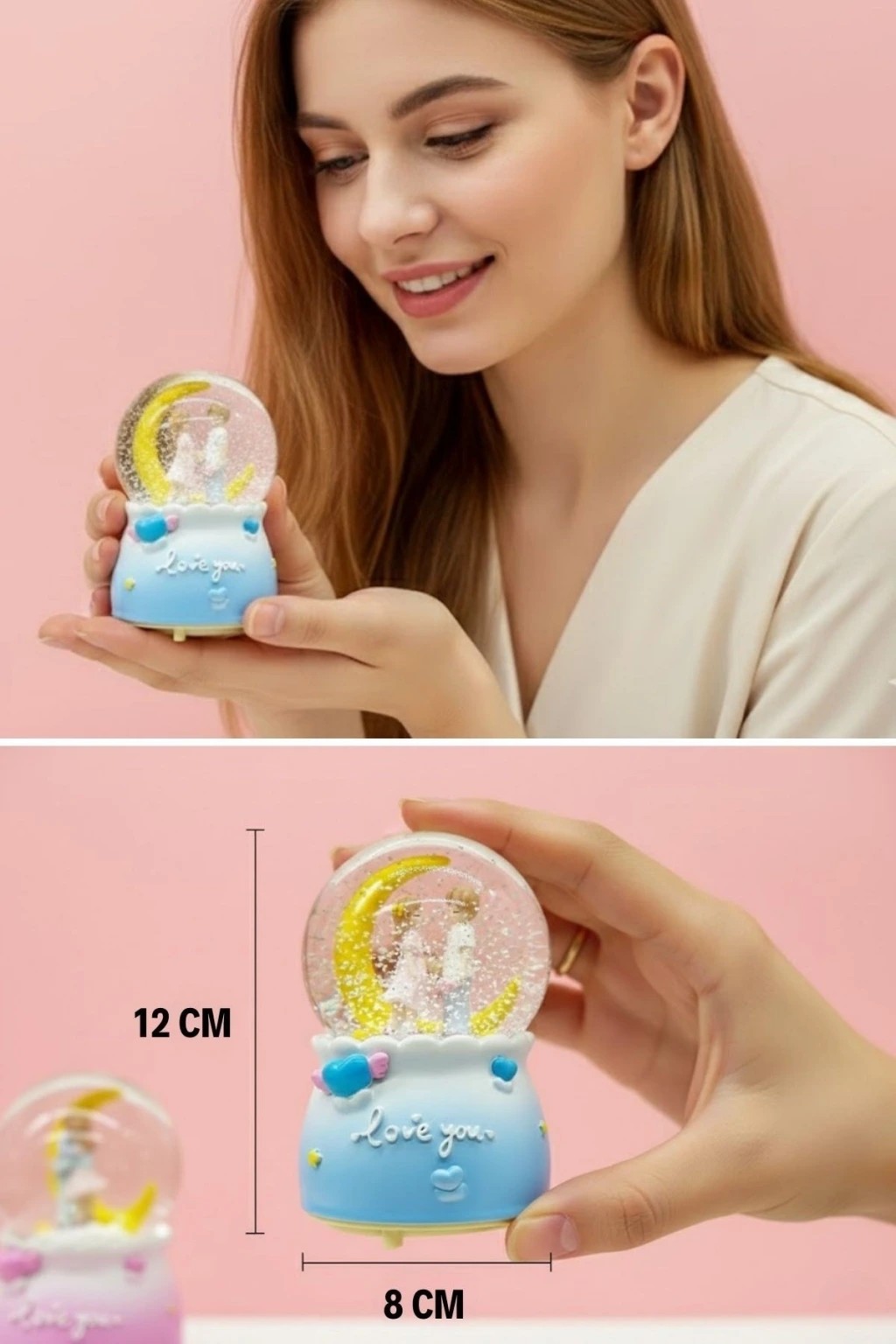 Işığı açıldığında kar tanelerinin ay figürü etrafında süzülmesi, loş ortamlarda şık ve huzur verici bir görünüm oluşturur. Müzik özelliğiyle birlikte romantik anlara eşlik ederken, sevdiklerinize hediye edebileceğiniz anlamlı ve estetik bir alternatif sunar. Sevgililer Günü, doğum günü, yıl dönümü ve özel günler için zarif bir hediyedir.