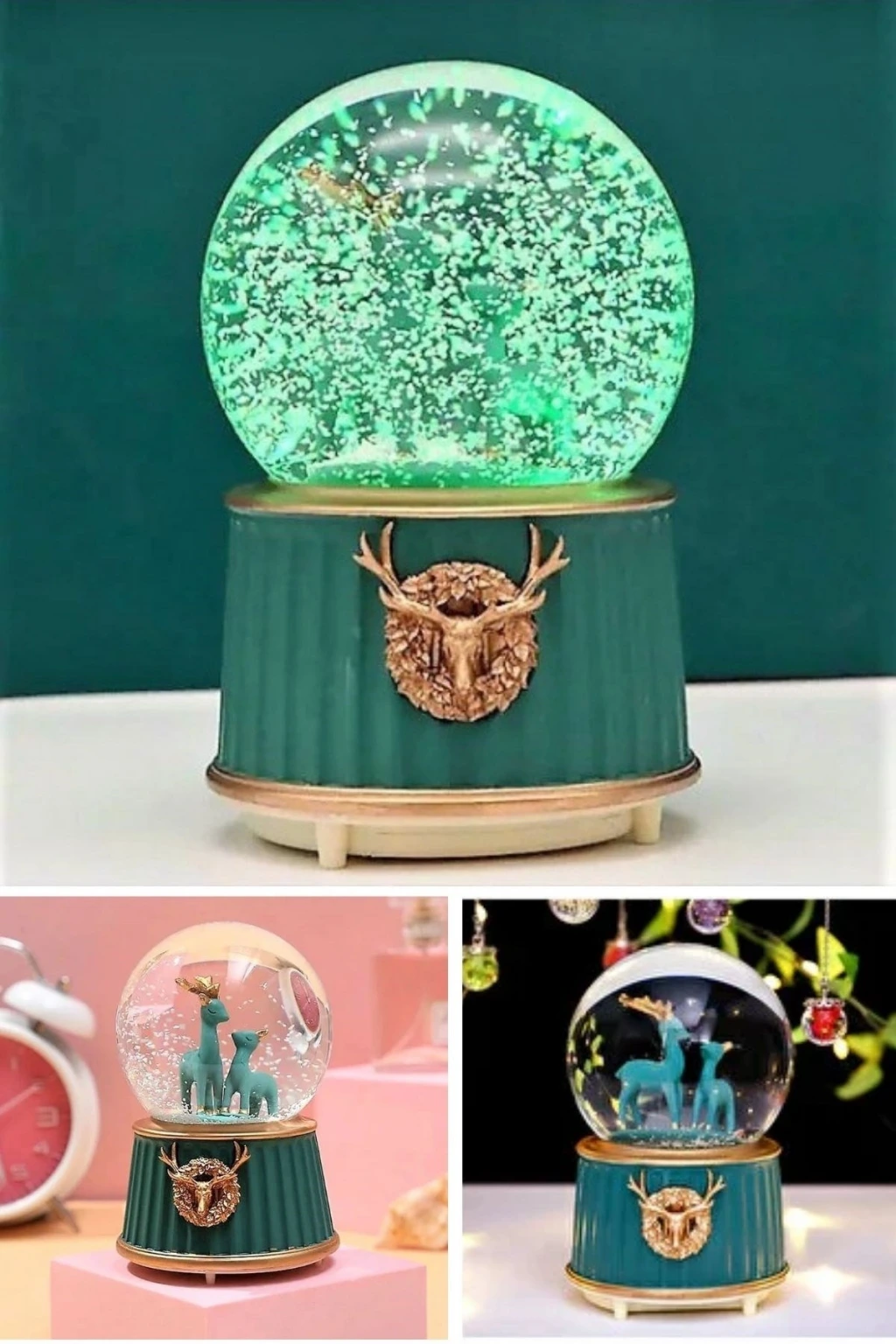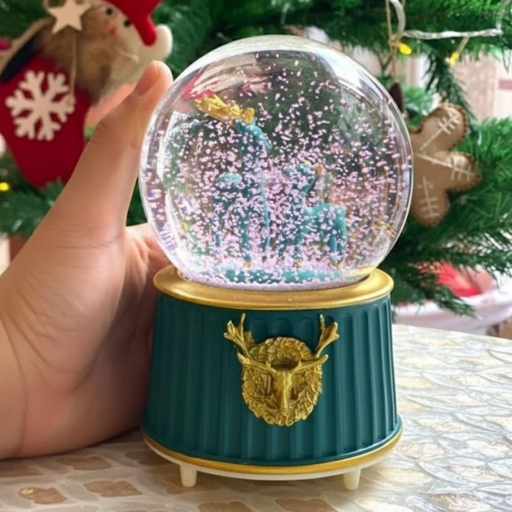 Pilli Işıklı Müzikli Kar Küresi–İki Geyikli Yeşil Figürlü Eğlenceli Masaüstü Biblo, LED Aydınlatmalı Dekoratif Hediyelik Kar Küresi