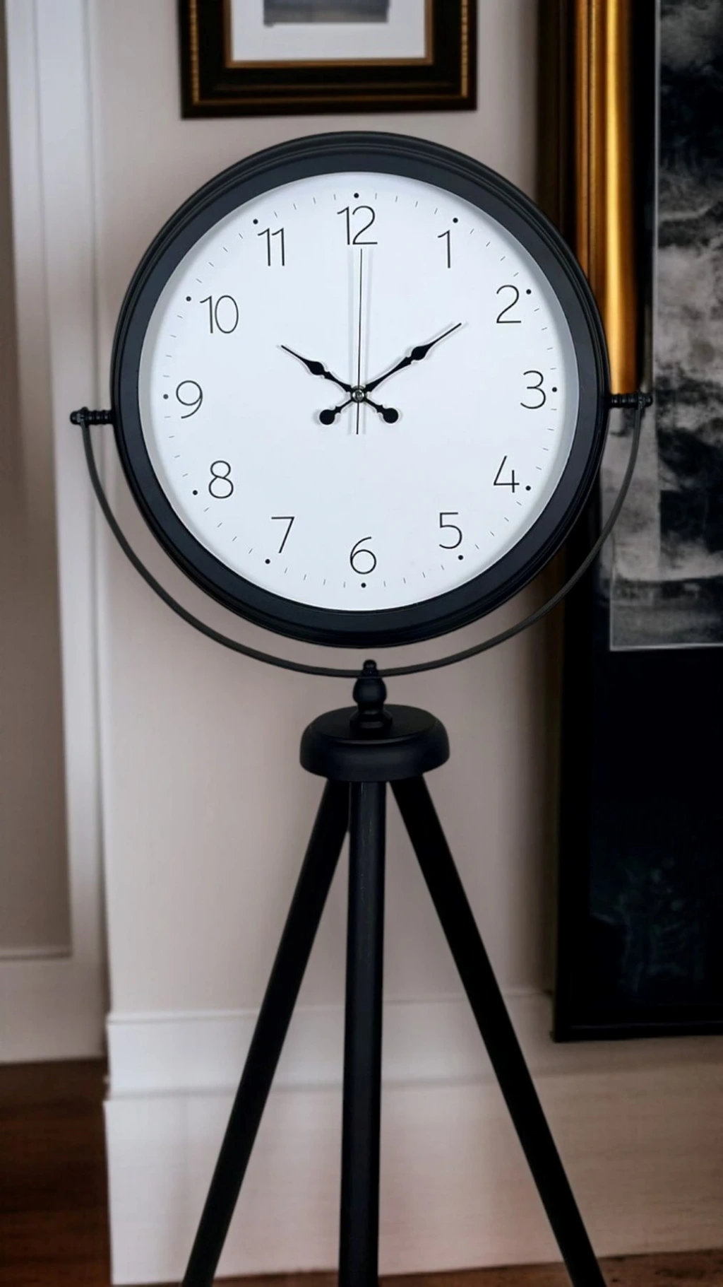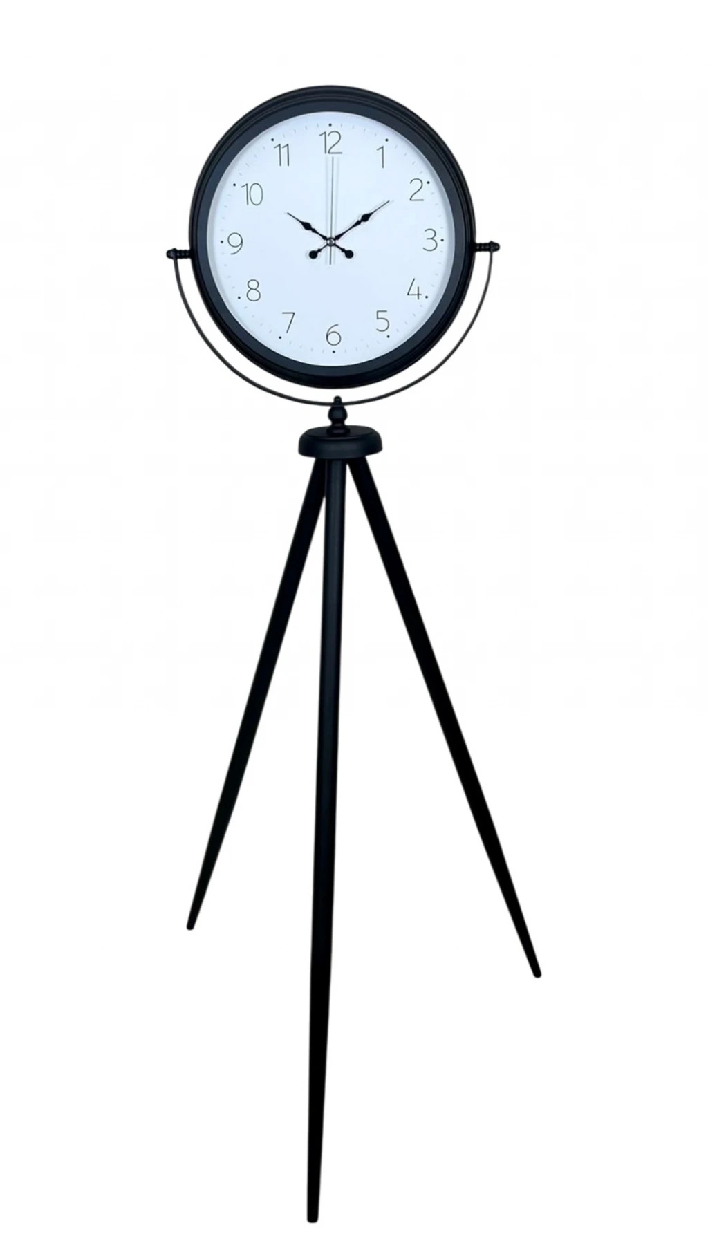 Üç ayaklı tripod formu, saate hem dekoratif hem de mimari bir karakter kazandırır. Dengeli ayak yapısı sayesinde zeminde sağlam durur, güvenli kullanım sağlar. Siyah metal gövdesi, modern ve endüstriyel dekorasyon tarzlarıyla mükemmel uyum sağlarken; klasik mekânlarda da şık bir kontrast oluşturur.