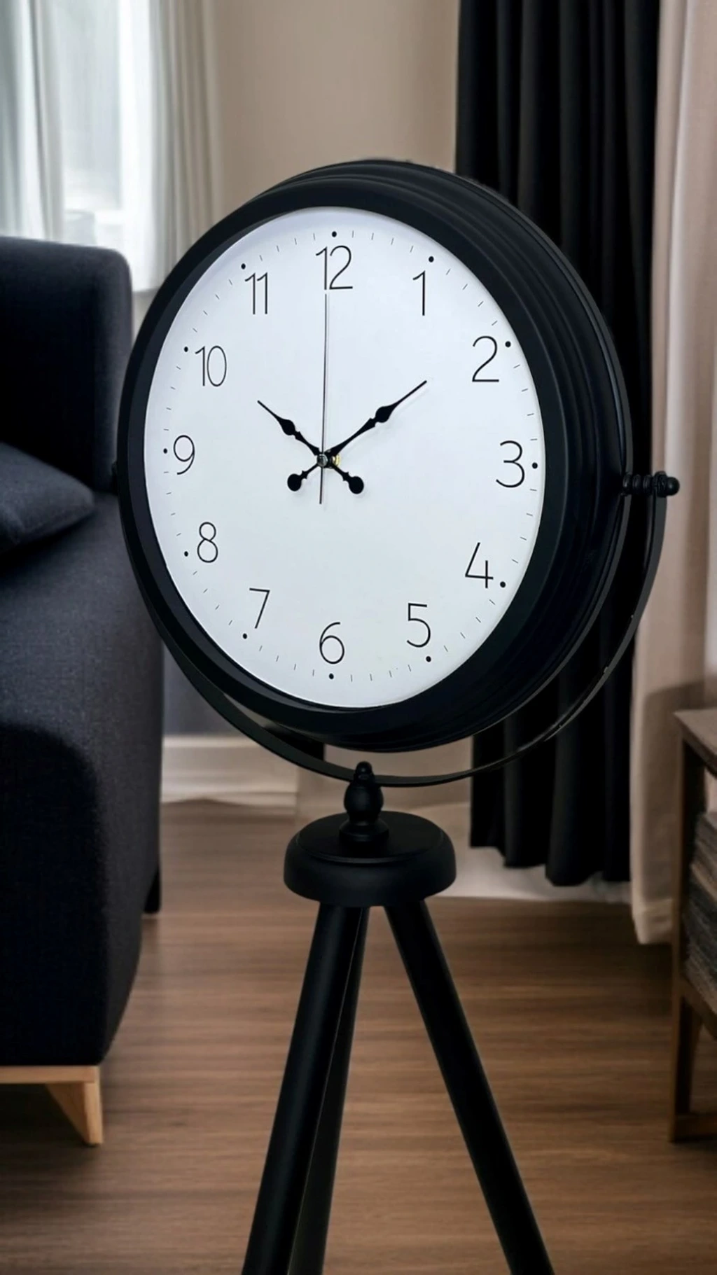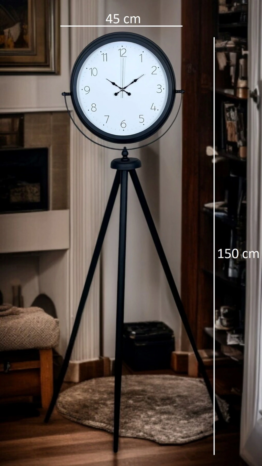 Modern tasarım anlayışı ile klasik saat estetiğini bir araya getiren siyah tripod ayaklı dekoratif saat, bulunduğu mekânda güçlü bir duruş sergileyerek dekorasyonun odak noktası haline gelir. 150 cm yüksekliği sayesinde salon, ofis, vitrin ve geniş yaşam alanlarında rahatlıkla fark edilir; sıradan duvar saatlerinden çok daha etkileyici bir görünüm sunar.