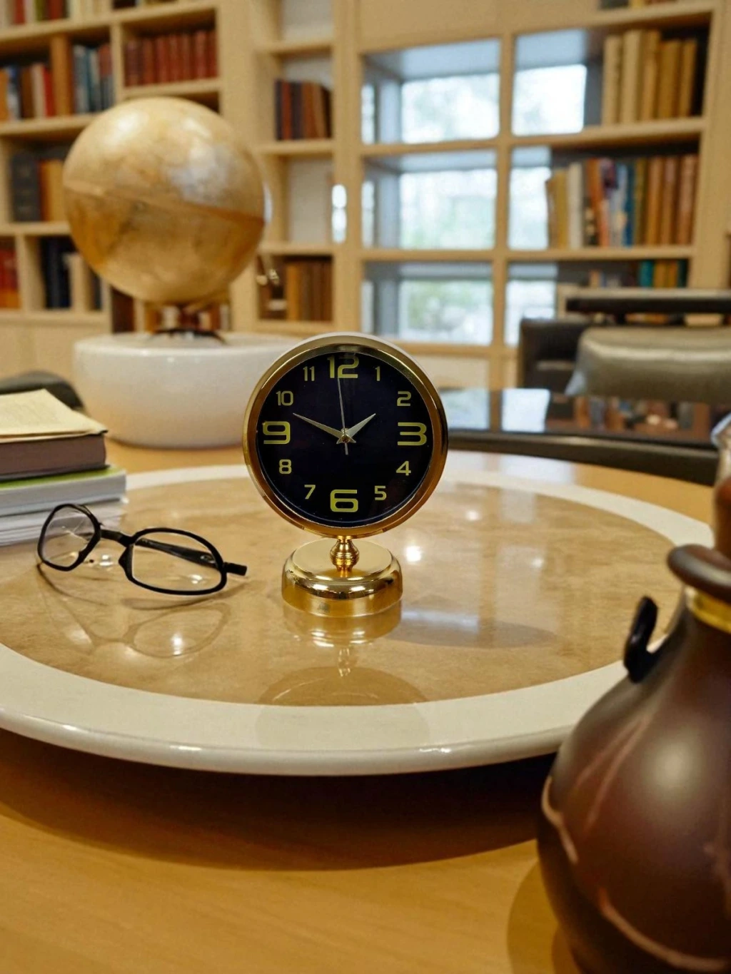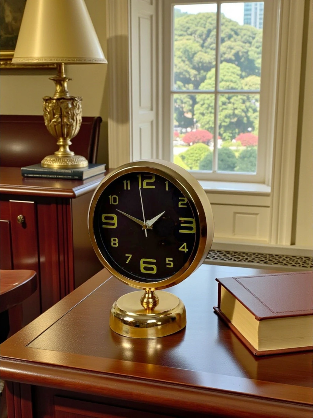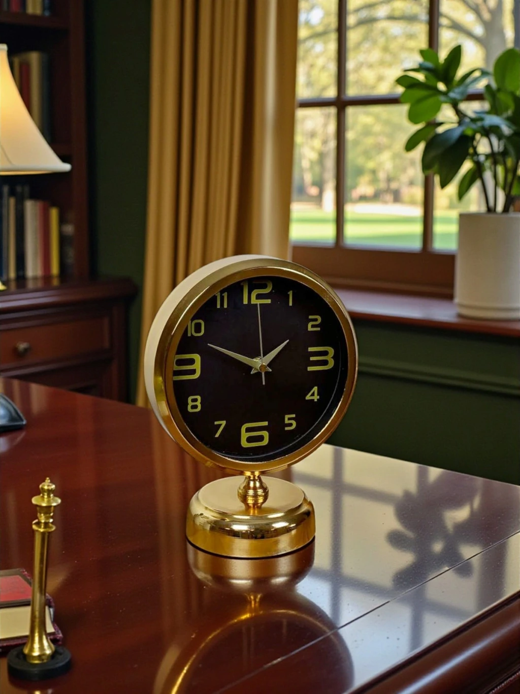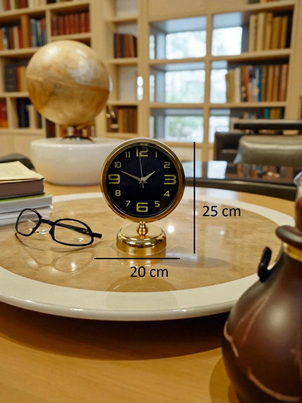 Parlak gold kaplaması ve siyah kadranı ile güçlü bir görsel etki yaratan bu masa saati, klasik ve modern çizgileri bir araya getirerek bulunduğu ortama prestijli bir hava katar. Siyah zemin üzerine yerleştirilmiş gold rakamlar, hem yüksek okunabilirlik sunar hem de saate sofistike bir karakter kazandırır. Ofis masalarından salon konsollarına kadar birçok alanda dekoratif bir tamamlayıcı olarak öne çıkar.