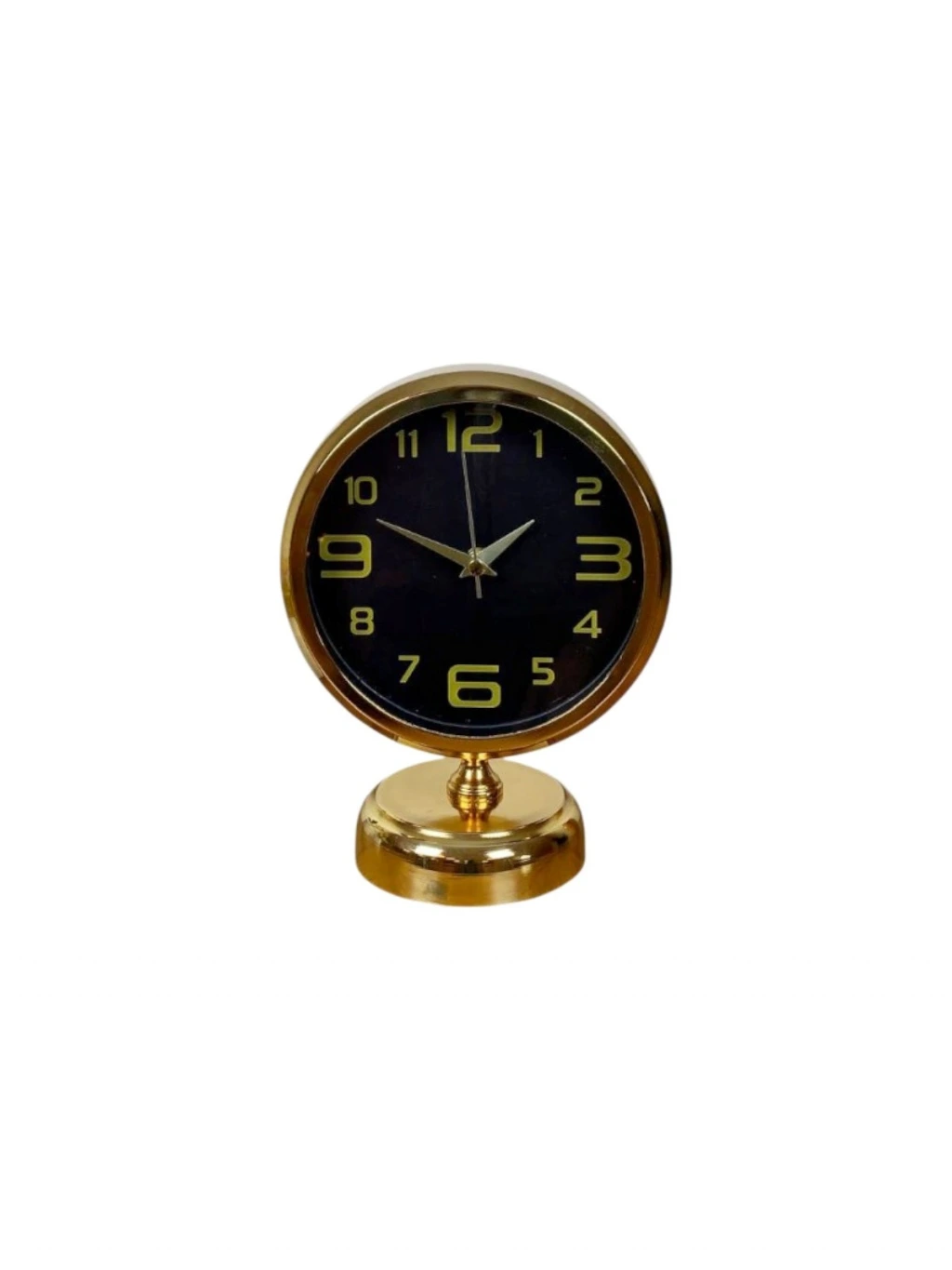 Metal gövdesi ve sağlam tabanı sayesinde dengeli bir duruşa sahiptir. Gold kaplama yüzeyi ışığı zarif şekilde yansıtarak ürüne lüks bir görünüm kazandırır. Zamansız tasarımı sayesinde modası geçmeden uzun yıllar kullanılabilecek, hem işlevsel hem de dekoratif bir masa saatidir.