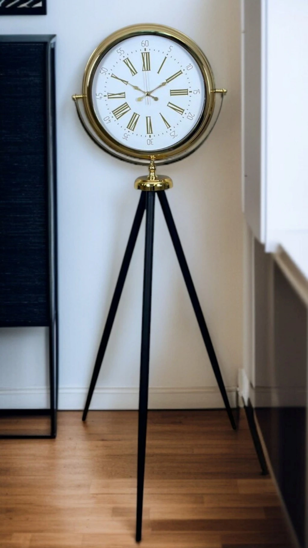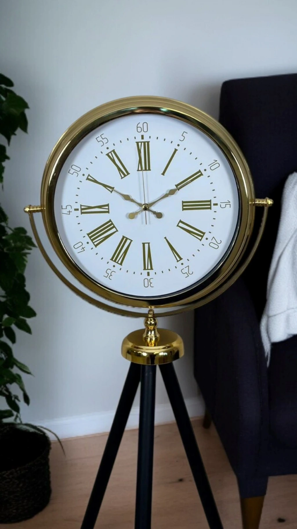Klasik tasarımın modern çizgilerle buluştuğu bu gold tripod ayaklı saat, bulunduğu mekâna ilk bakışta şıklık ve prestij katar. Altın renkli metal gövdesi, siyah tripod ayakları ve beyaz kadranı ile hem zamansız hem de dekoratif bir duruş sunar. Salon, ofis, antre, lobi ve butik mekânlar için güçlü bir odak noktasıdır.