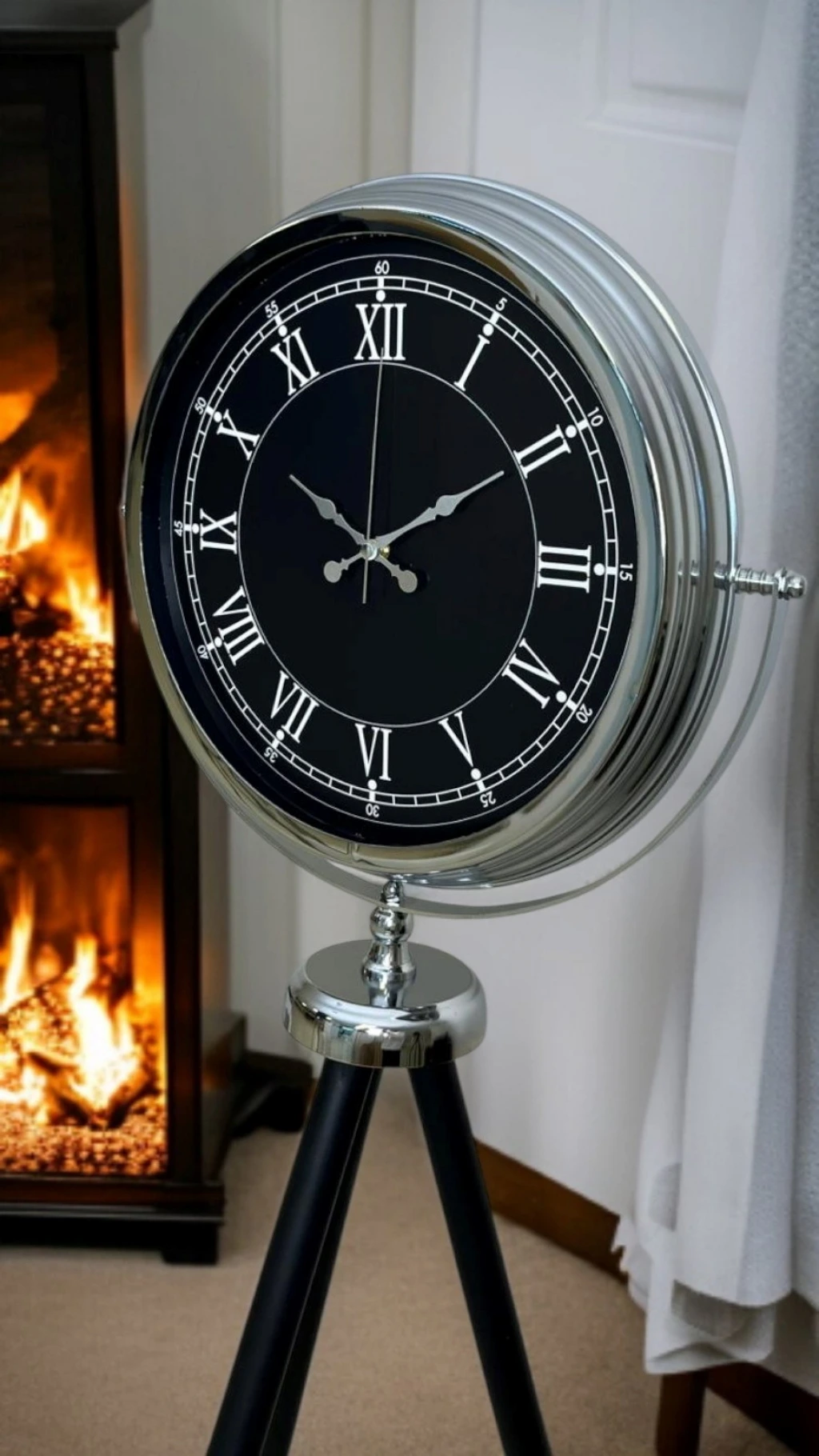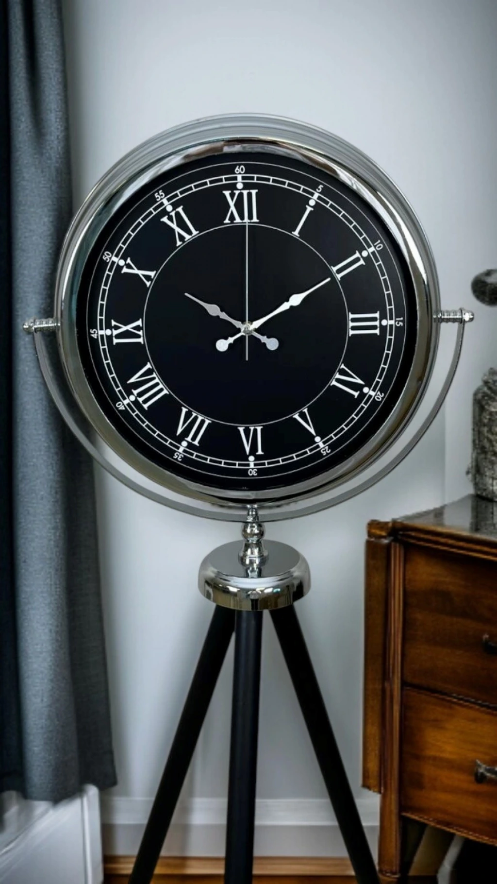 Zamanı yalnızca göstermekle kalmayıp bulunduğu ortama güçlü bir karakter kazandıran bu krom tripod ayaklı dekoratif saat, klasik Roma rakamlı kadranı ve modern tripod formu ile dikkat çeken özel bir tasarımdır. 150 cm yüksekliği sayesinde mekânda ilk bakışta fark edilen bu model; salon, ofis, lobi, otel, mağaza ve prestijli yaşam alanları için sıradan saatlerden çok daha fazlasını sunar.