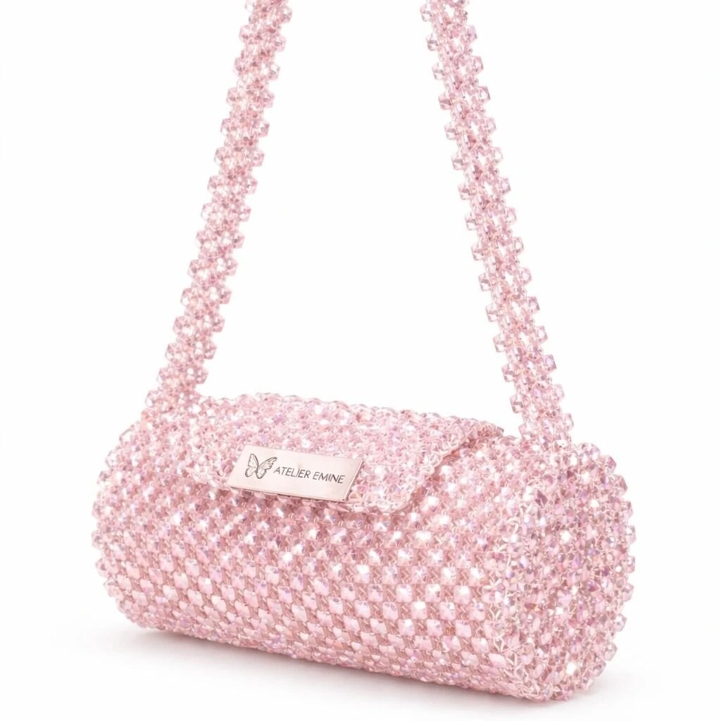 Kristal boncuklar tek tek örülerek homojen bir yüzey dokusu elde edilmiş; gövde, silindirik formda yapılandırılarak kendi kendini taşıyabilen dengeli bir strüktür oluşturulmuştur. Kristal örgü yoğunluğu, çantanın form bütünlüğünü ve estetik sürekliliğini destekler.