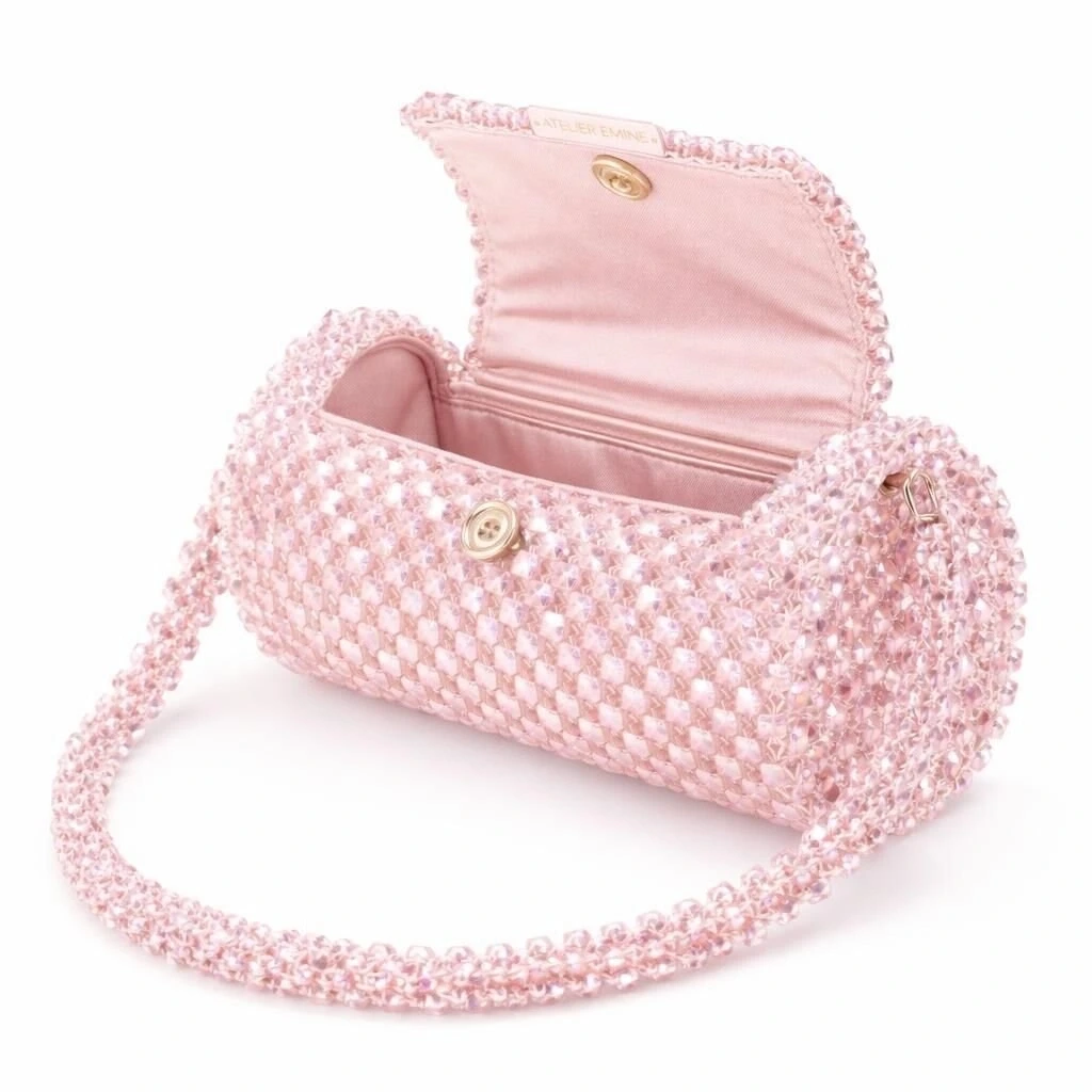 Atelier Emine’in Crystal Gelato Couture serisine ait Ricotta Baby, 8 mm optik sınıfı kristal boncukların yüksek dayanımlı misina ile örülmesiyle tamamen el işçiliğiyle üretilmiş, zamansız ve rafine bir mini çanta tasarımıdır.