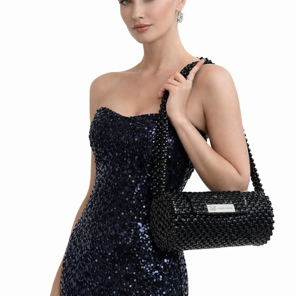 Kristal boncuklar tek tek örülerek homojen bir yüzey dokusu elde edilmiş; gövde, silindirik formda yapılandırılarak kendi kendini taşıyabilen dengeli bir strüktür oluşturulmuştur. Kristal örgü yoğunluğu, çantanın form bütünlüğünü ve estetik sürekliliğini destekler.