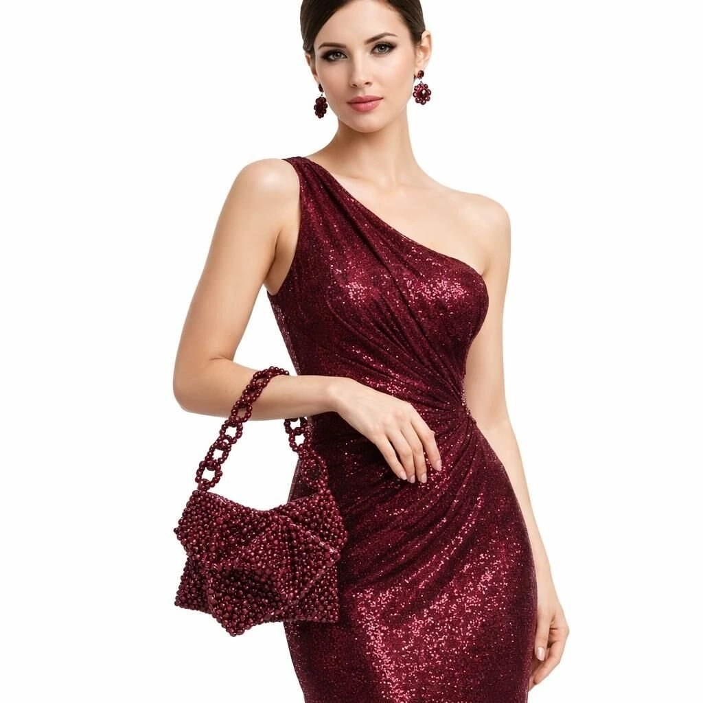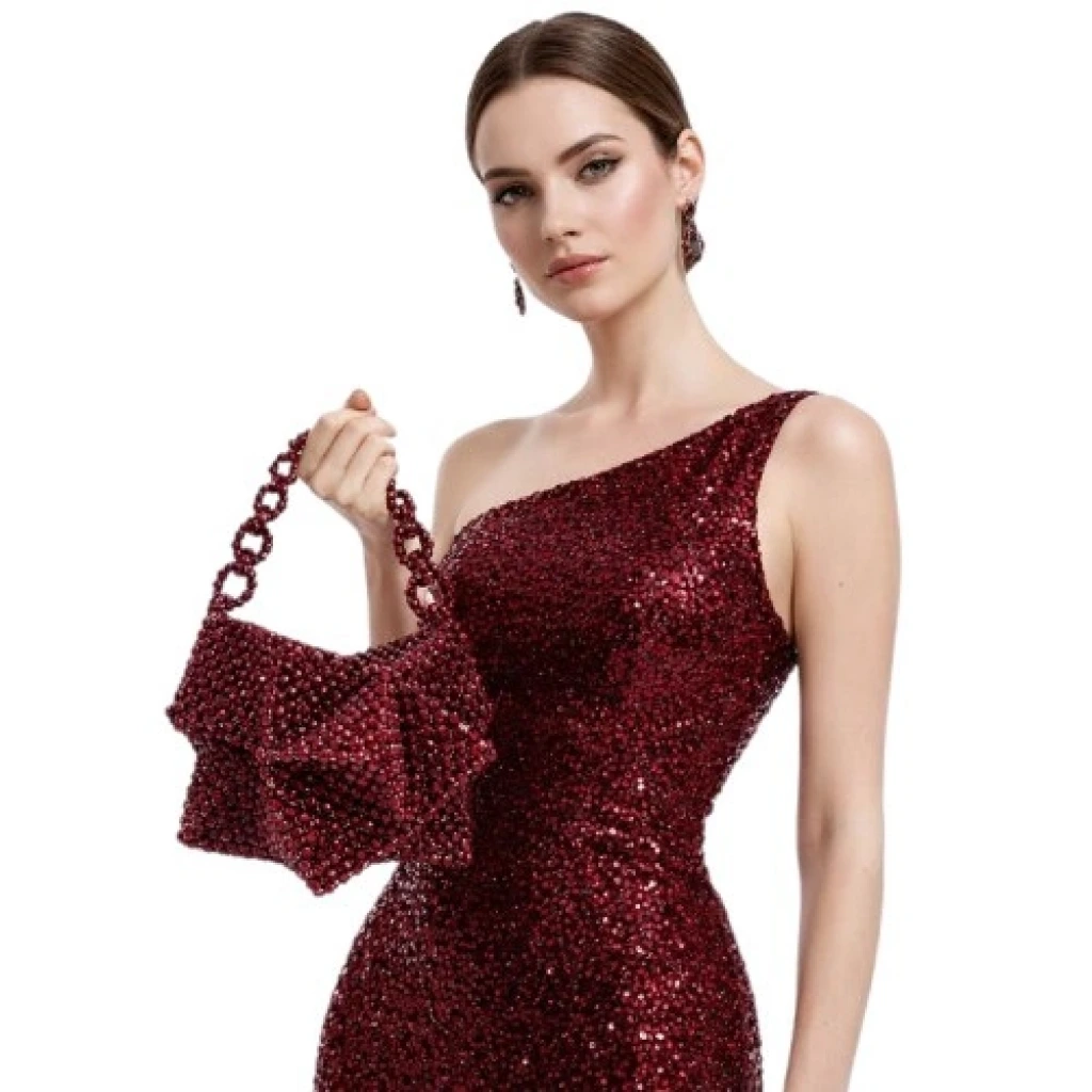 Çanta gövdesi, 8 mm standart yuvarlak kesim optik kristal boncukların, yüksek mukavemetli monofilament misina kullanılarak tek tek örülmesiyle tamamen el işçiliğiyle oluşturulmuştur. Kristallerin homojen dizilimi sayesinde yüzey boyunca kesintisiz bir ışık kırılımı elde edilirken, örgü yoğunluğu çantanın kendi kendini taşıyabilen dengeli bir strüktür kazanmasını sağlar.