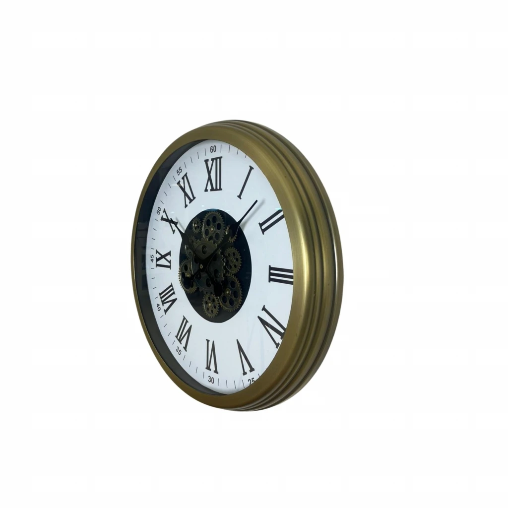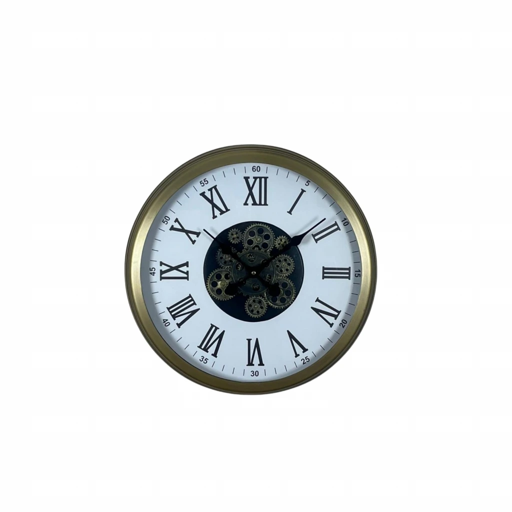 Merkezde konumlanan dekoratif hareketli çark mekanizması, sade tasarıma mekanik bir derinlik kazandırır. 60 cm geniş çapı ile büyük duvarlarda güçlü ve estetik bir odak noktası oluşturur.