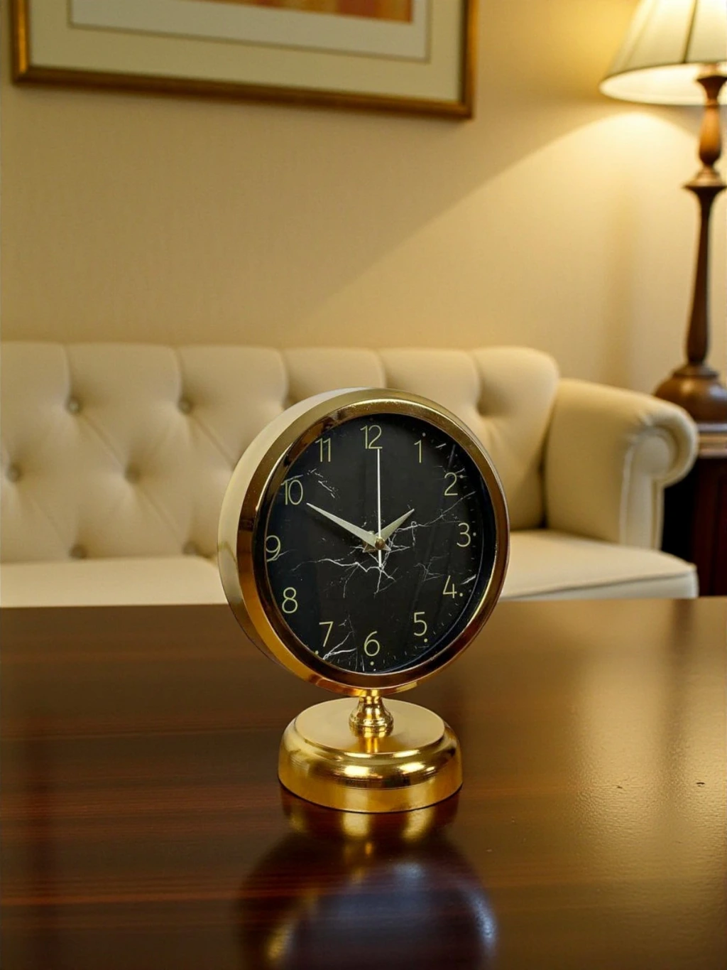 Parlak gold gövdesi ve siyah mermer desenli kadranıyla öne çıkan bu masa saati, dekorasyonda fark yaratmak isteyenler için tasarlanmıştır. Siyah zemin üzerindeki ince mermer efektler saate modern ve sofistike bir karakter kazandırırken, gold rakam ve akrep-yelkovan detayları lüks bir duruş sunar. Klasik yuvarlak formu sayesinde hem modern hem de klasik dekorasyon tarzlarına kolayca uyum sağlar.