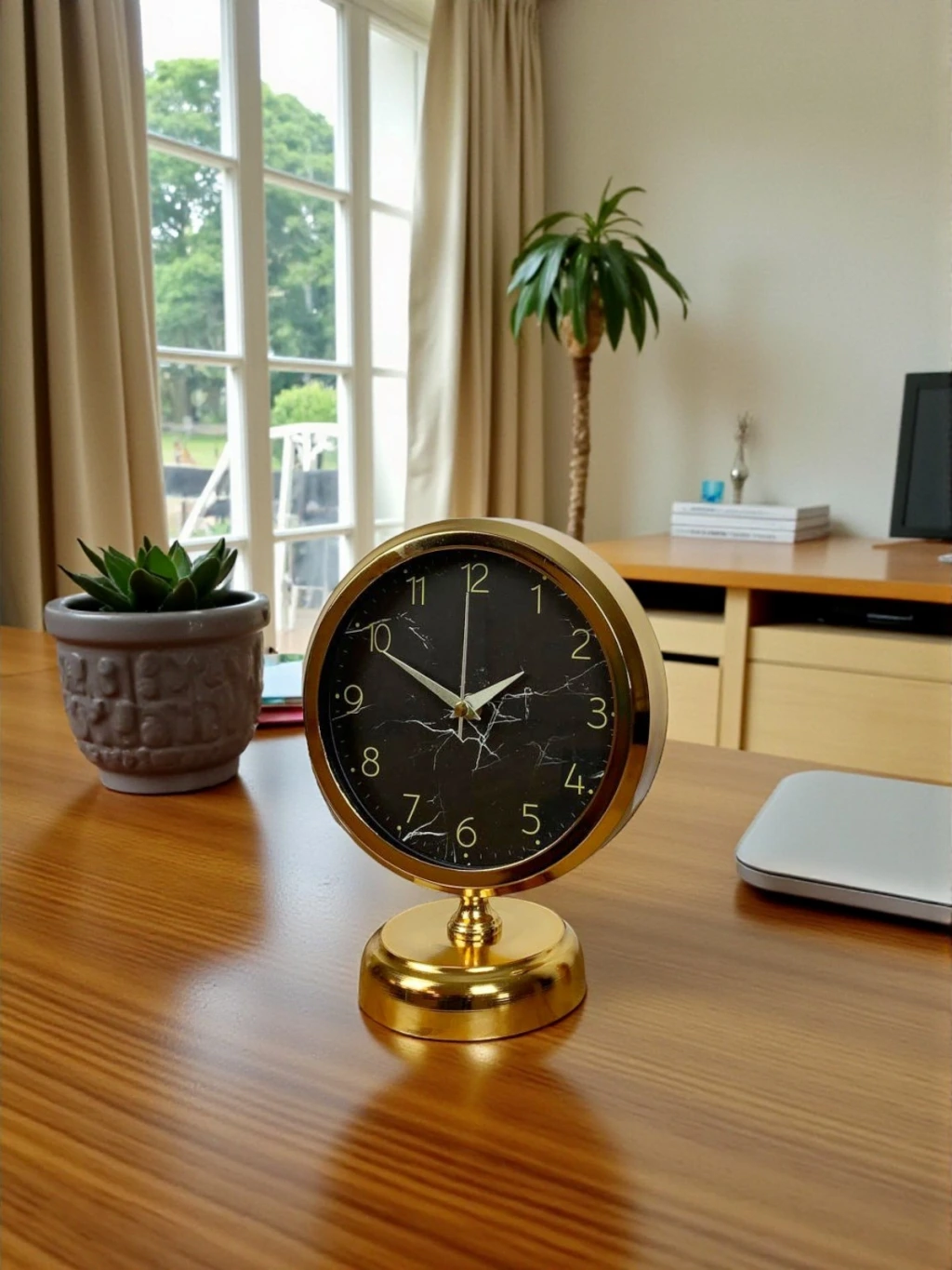 Metal gövdesi ve ağır, dengeli tabanı sayesinde masa üzerinde sağlam bir duruş sergiler. Gold kaplamanın ışığı yumuşak şekilde yansıtması, saate hem dikkat çekici hem de zarif bir görünüm kazandırır. Dekoratif olduğu kadar işlevsel olan bu masa saati, zamansız tasarımıyla uzun yıllar keyifle kullanılabilecek şık bir tamamlayıcıdır.