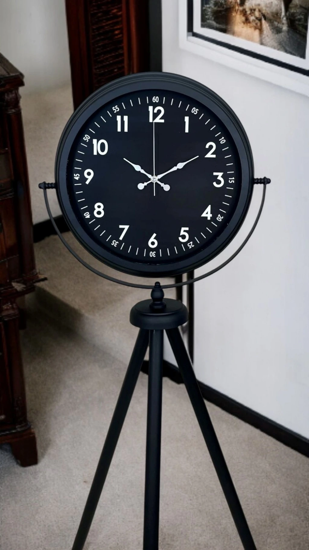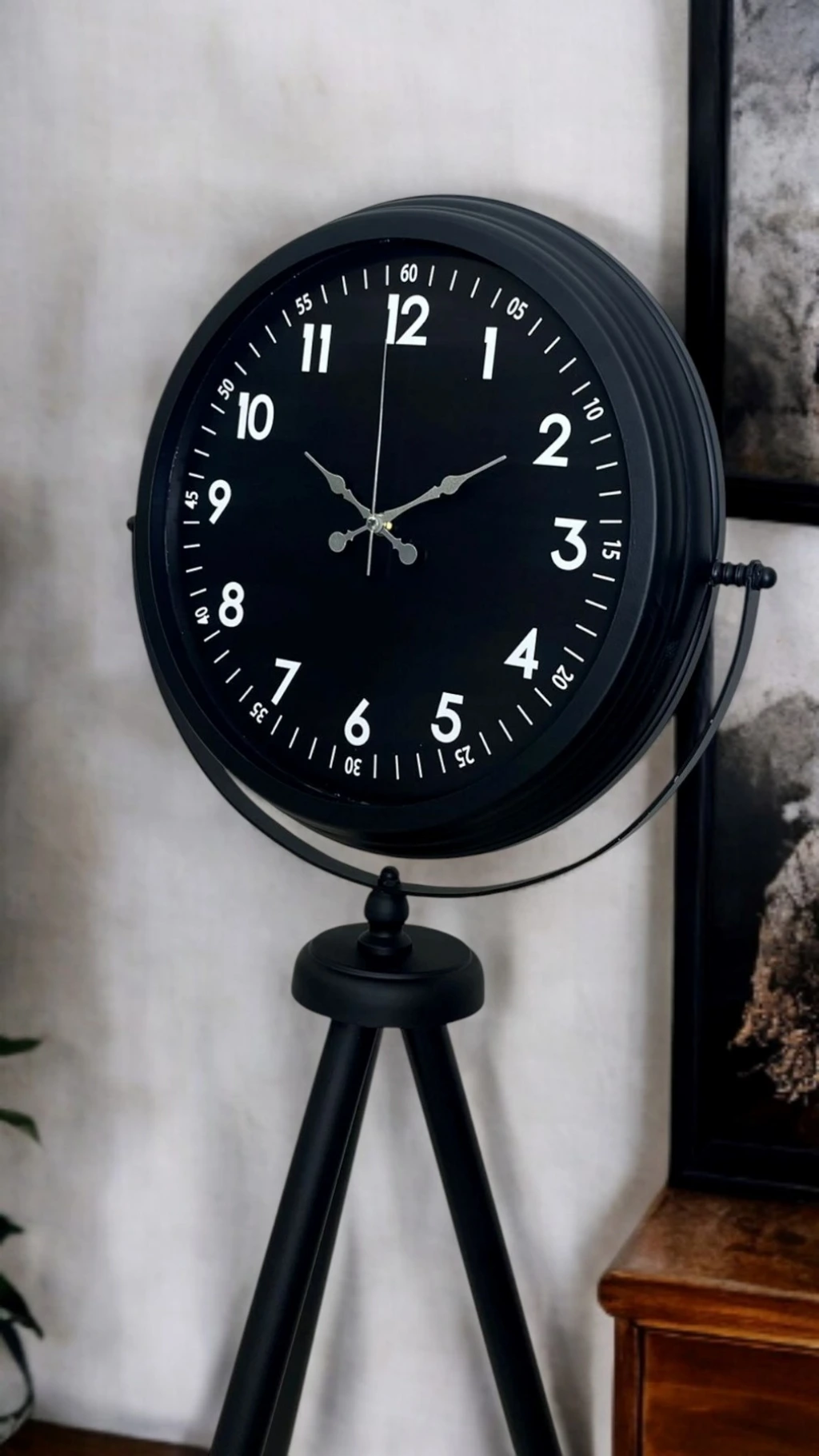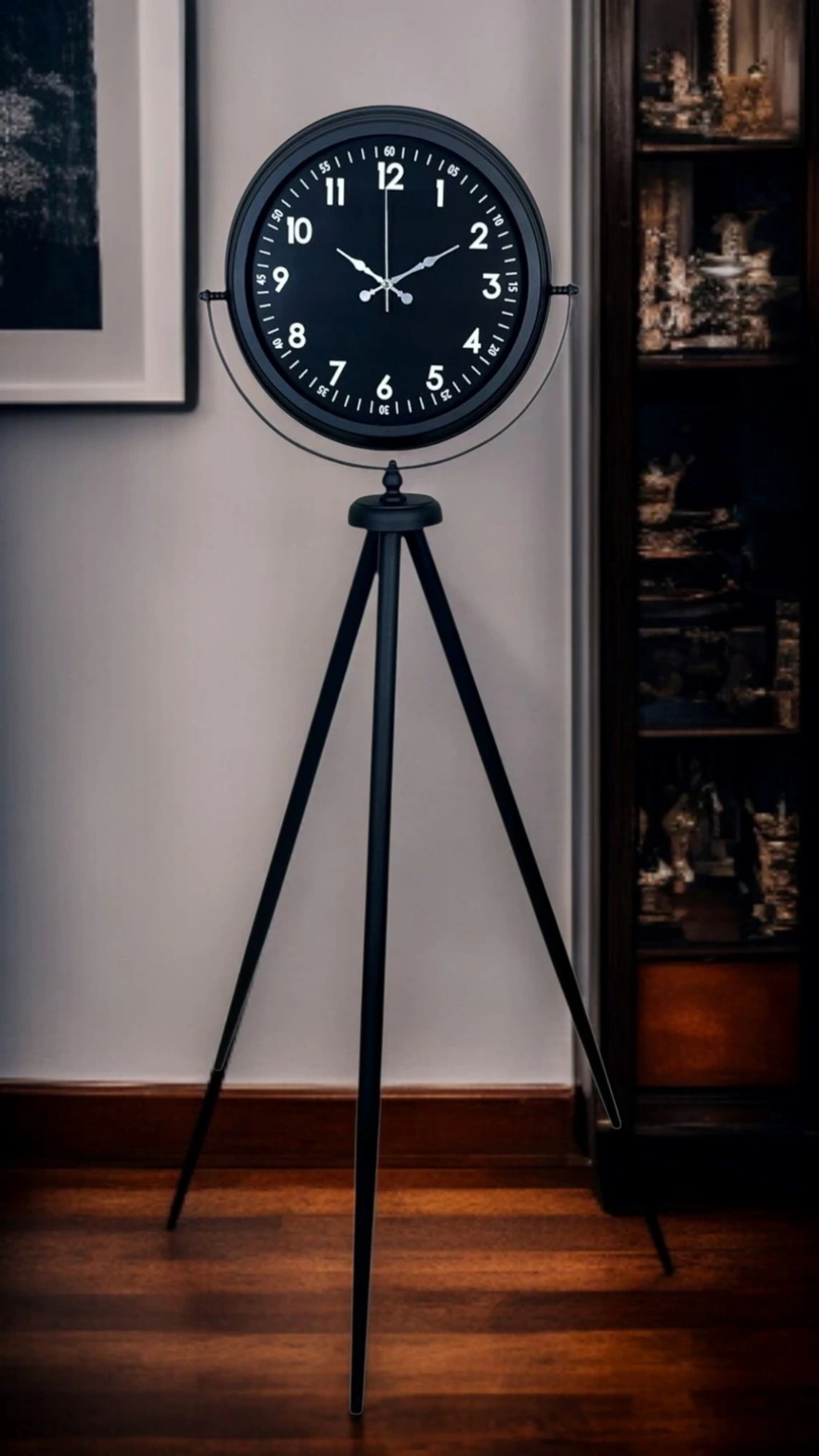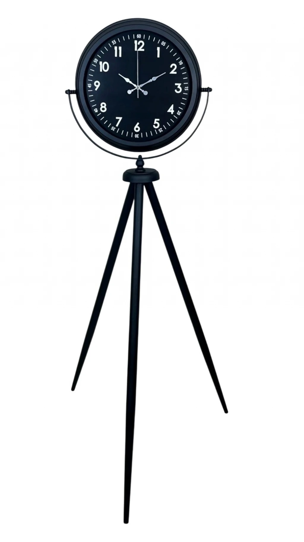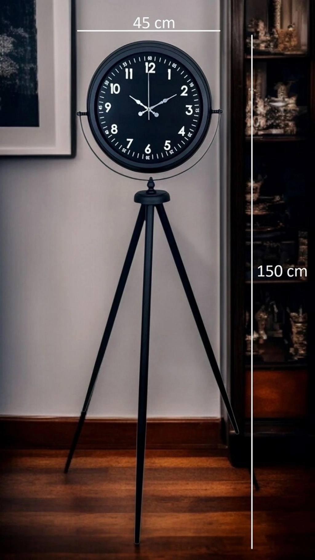 Güçlü duruşu ve zamansız tasarımıyla öne çıkan siyah tripod ayaklı dekoratif saat, modern yaşam alanlarına sofistike bir karakter kazandırmak için tasarlanmıştır. Tamamı siyah tonlardan oluşan kadranı ve gövdesi sayesinde sade ama etkileyici bir görünüm sunar. 150 cm yüksekliği ile bulunduğu ortamda kendini hemen belli eder ve dekorasyonun odak noktası haline gelir.