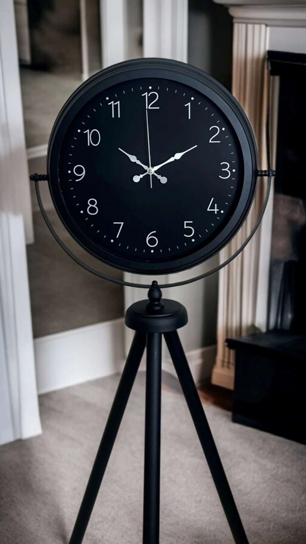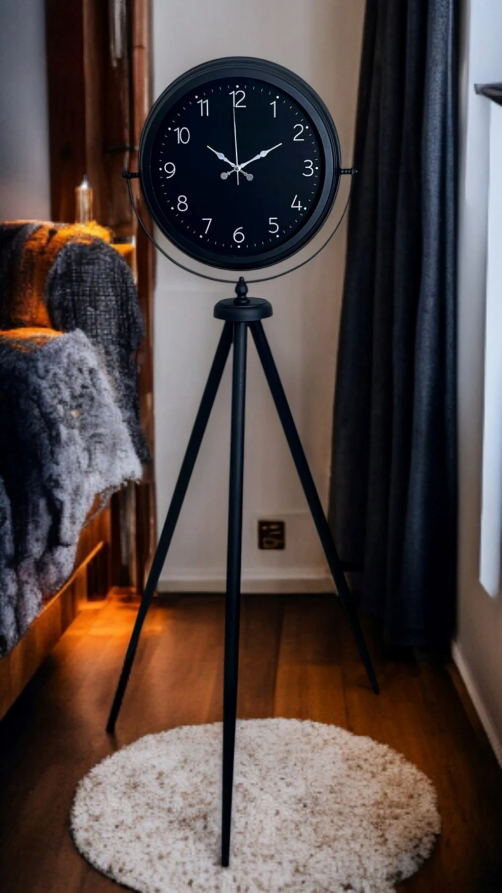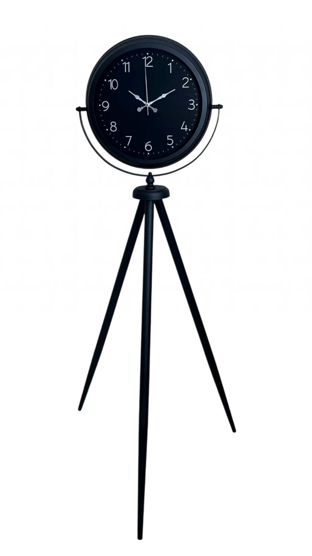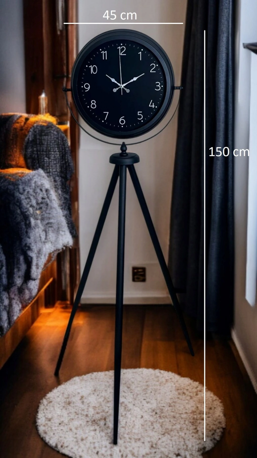 Yaşam alanlarında modern ve güçlü bir duruş isteyenler için tasarlanan Siyah Tripod Ayaklı Dekoratif Salon Saati, 150 x 45 cm ölçüsüyle salon, ofis ve geniş mekanlarda dikkat çeken bir dekor objesi olarak öne çıkar. Siyah metal tripod ayak formu, ürüne hem estetik hem de dengeli bir yapı kazandırırken; siyah kadran üzerindeki minimal rakam tasarımı modern çizgileri sevenler için zamansız bir şıklık sunar.