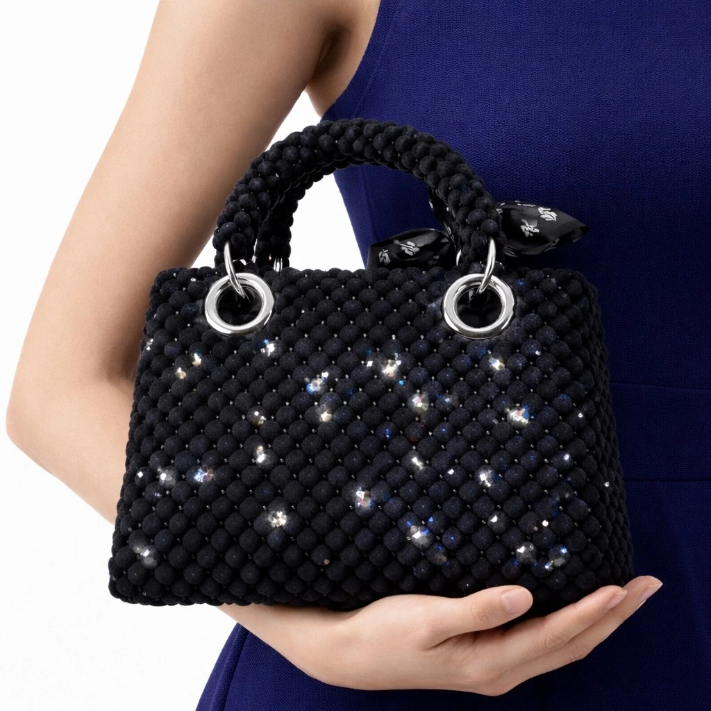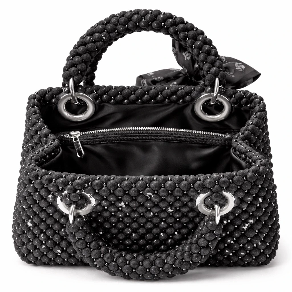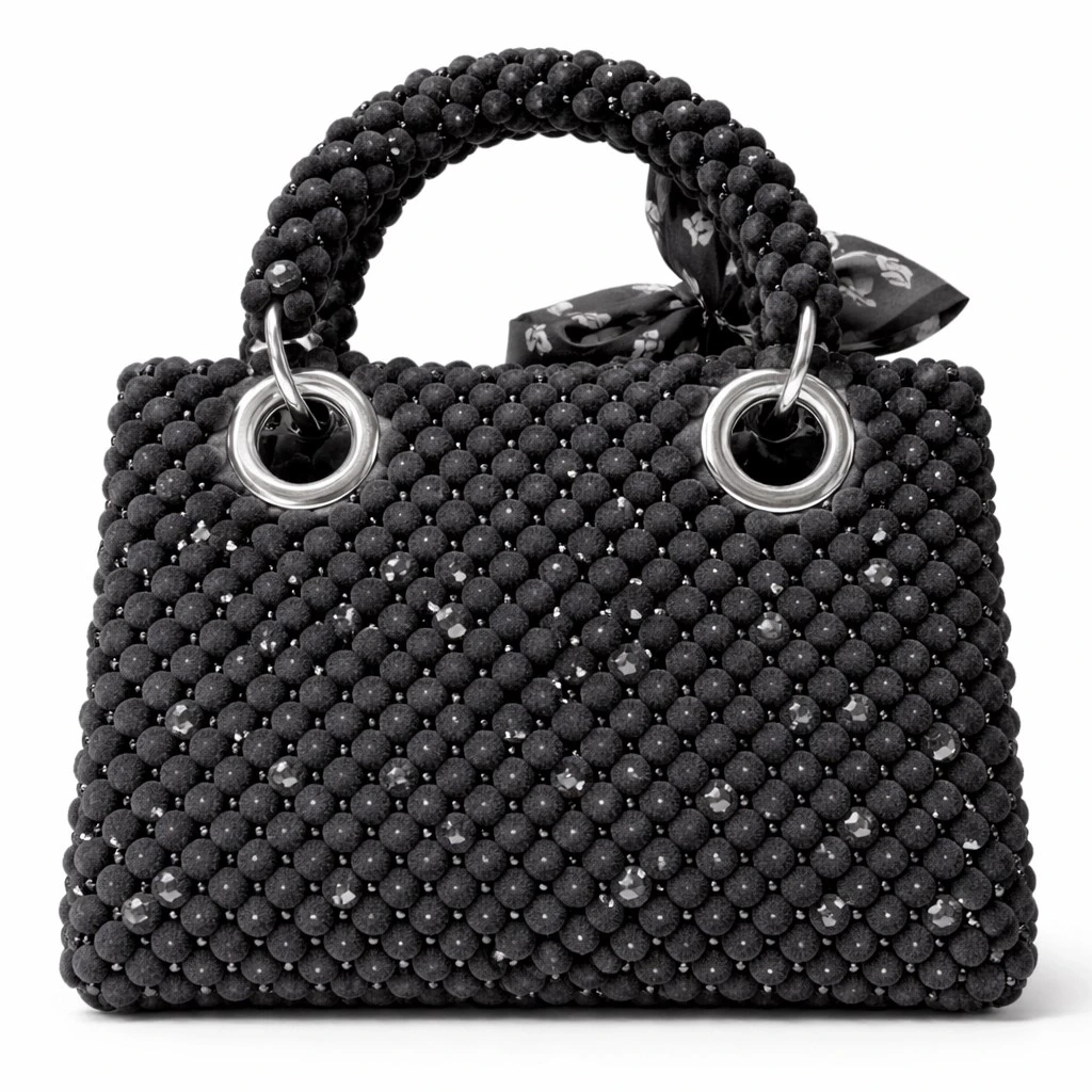 Silva Gunmetal’ın strüktürü, boncukların birbirine kilitlenen örgü düzeni sayesinde dikişsiz ve kesintisiz bir yüzey bütünlüğü sunar. Boncuk aralarındaki mikro boşluklar, yüzeyde doğal bir derinlik ve ritim oluşturarak tasarıma organik ama kontrollü bir karakter kazandırır. Bu yoğun örgü, çantaya heykelsi bir hacim verirken, couture seviyesinde bir işçilik algısı yaratır.