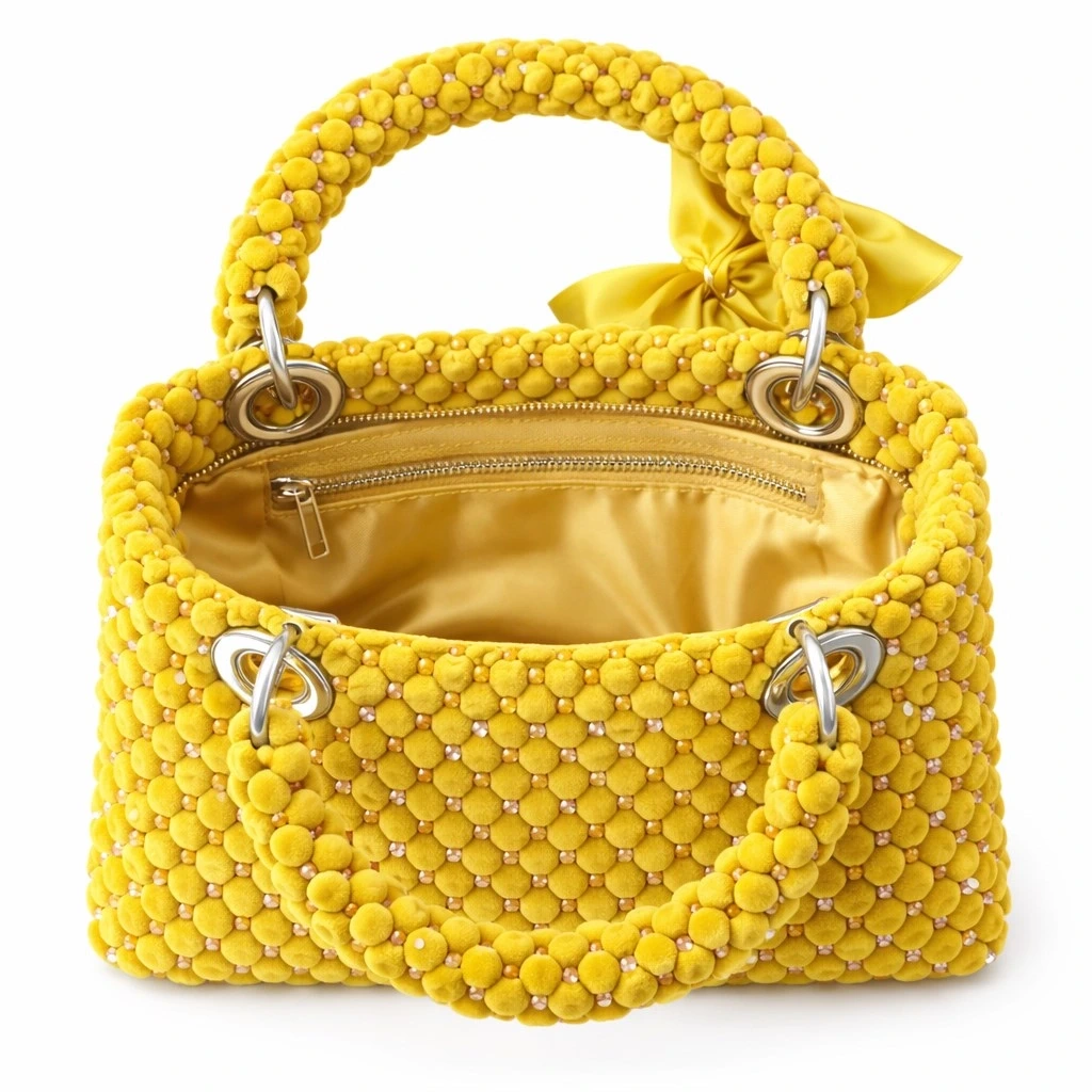 Silva Mimosa’nın strüktürü, boncukların birbirine kilitlenen örgü düzeni sayesinde dikişsiz ve kesintisiz bir yüzey bütünlüğü sunar. Boncuk aralarındaki mikro boşluklar, yüzeyde doğal bir derinlik ve ritim oluşturarak tasarıma organik ama kontrollü bir karakter kazandırır. Bu yoğun örgü, çantaya heykelsi bir hacim verirken, couture seviyesinde bir işçilik algısı yaratır.