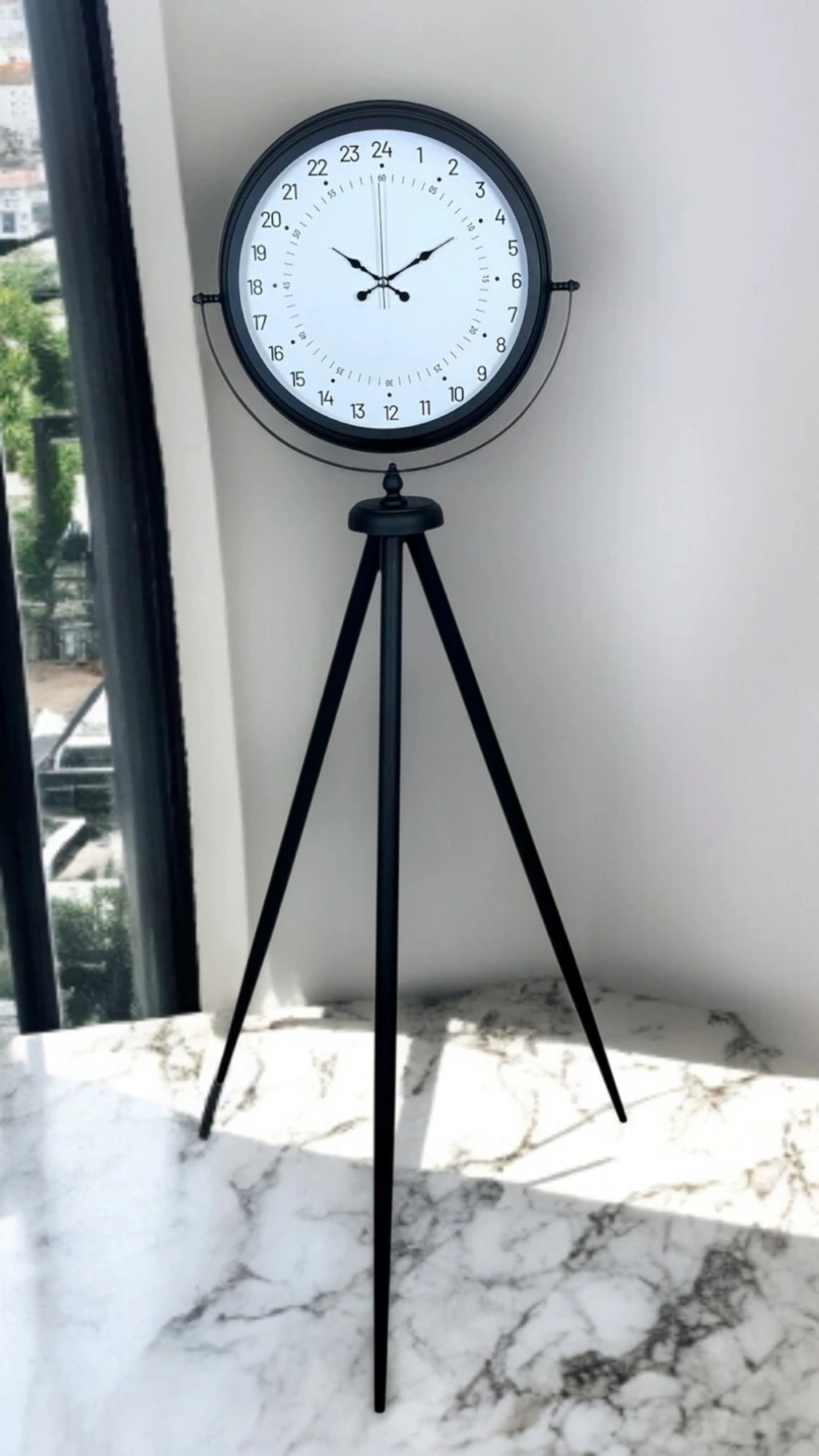 150 x 45 cm ölçüsüyle geniş salonlar, ofisler, antreler, mağazalar ve vitrin alanları için ideal olan bu model; siyah metal tripod ayak yapısı sayesinde modern, loft ve endüstriyel dekorasyonlara kusursuz uyum sağlar. Tripod formu zeminde dengeli bir duruş sunarken, mekâna mimari bir şıklık katar. Saat yalnızca zamanı göstermez, aynı zamanda bulunduğu alanın dekoratif odak noktası haline gelir.