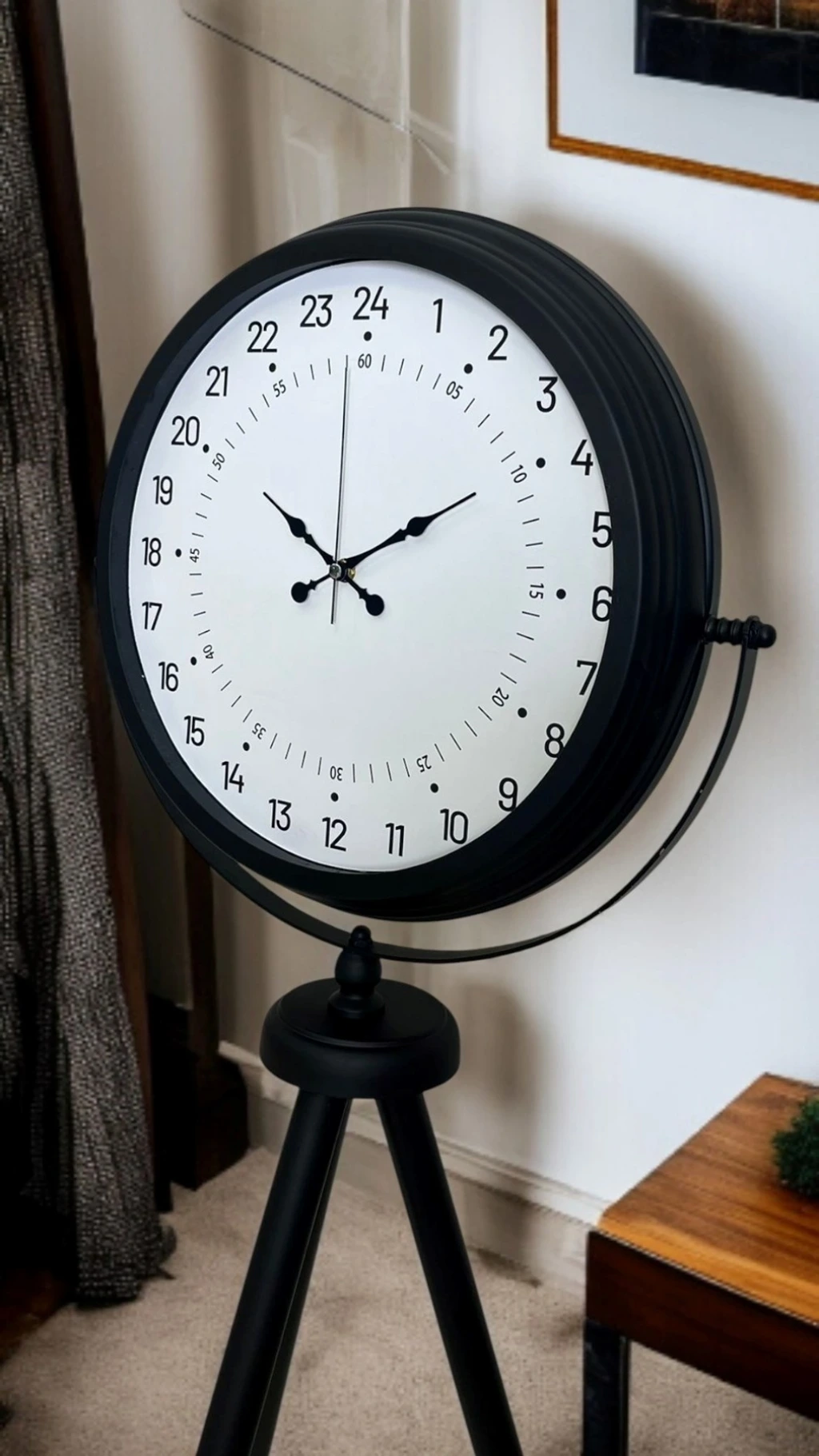 Standart saat anlayışının dışına çıkan, 24 saat göstergeli kadranı ile diğer saatlerden ayrılan bu siyah tripod ayaklı dekoratif salon saati, hem fonksiyonel hem de güçlü bir tasarım objesidir. Alışılmış 12 saatlik klasik saatlerin aksine, günün tamamını tek kadranda gösteren 24 saat sistemi sayesinde zamanı farklı bir bakış açısıyla okumanızı sağlar. Bu özelliğiyle sıradan saatlerden ayrılır ve bulunduğu ortamda fark edilir bir stil oluşturur.